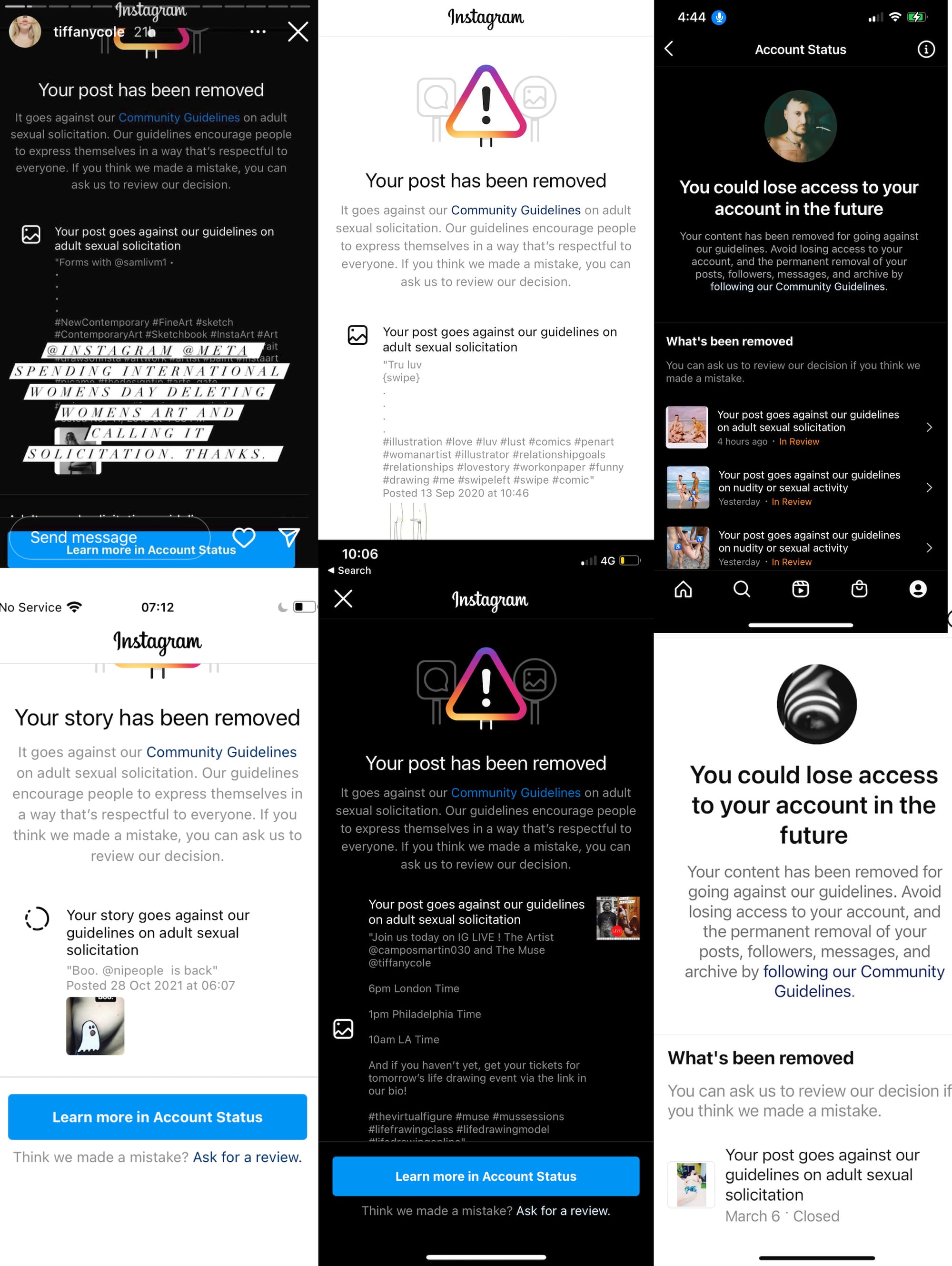 I am unfortunately accustomed to my artwork being removed from Instagram for “nudity,” despite Meta’s explicit allowance for nudity in art. Instagram’s lack of nuance in how their “nudity” guidelines are applied to art is a long-standing concern for many artists, but this new “sexual solicitation” notification was not only wrong, it is also offensive. This was no simple misreading of an image’s artistic merits, but an accusation and an overt sexualization of my artwork and my body.