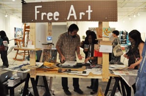There was constant action at #Rank, for which Winkleman Gallery cordoned off a section of the 24,000-square-foot exhibition space, a classroom-like setting with a “Hot Lips” pink chalkboard wall, two conference tables and folding chairs.