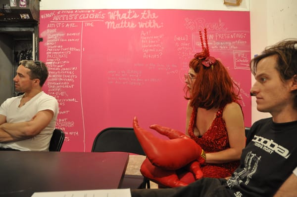 Everyone was welcome to participate that wanted to. People fluidly came and went in and out of conversations/performances. Some projects were spectacle, like Rebecca Goyette [pictured above] dressed up as a lobster, greeted, hugged, and talked to guests for an uncomfortable amount of time in “Hug It Out” — a project which has since received an undue amount of negative attention, and others were discussions, like Christopher K. Ho‘s round-table discussion about a return to “regional” art. Performances, lectures, video games, and cheese pizzas were all welcome in #Rank, and they accepted 99% of the people who applied.