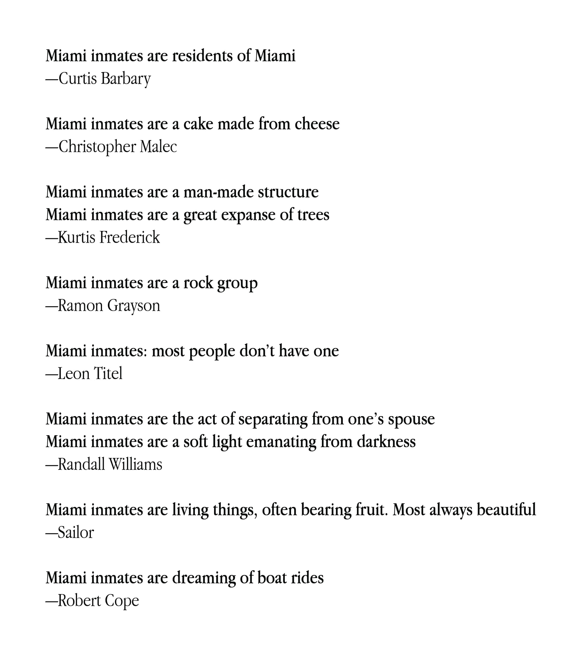 All of the poets are students enrolled in writing courses at Exchange for Change, founded by writer Kathie Klarreich, and supported in part by O, Miami, which hosts a poetry festival each April that aims to bring a poem to every person in Miami — residents of correctional institutions included.