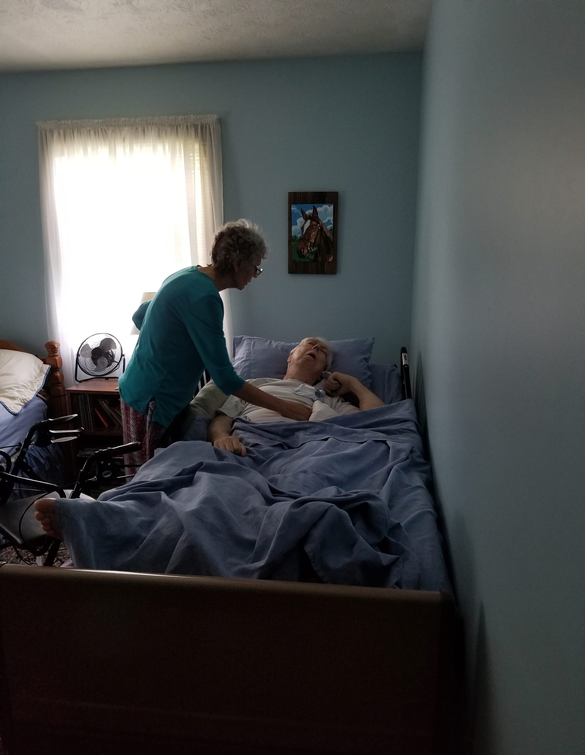 While taking care of her parents, LeBourgeois transitioned to making smaller paintings, finding that “the intimacy of a small scale seems to match the intimacy of caregiving.” Photographer and conceptual artist Michelle Burdine found the transition from a large format camera to her unobtrusive cell phone camera made sense when she began to document her mother’s experience within the American healthcare system while caring for two rapidly declining parents.