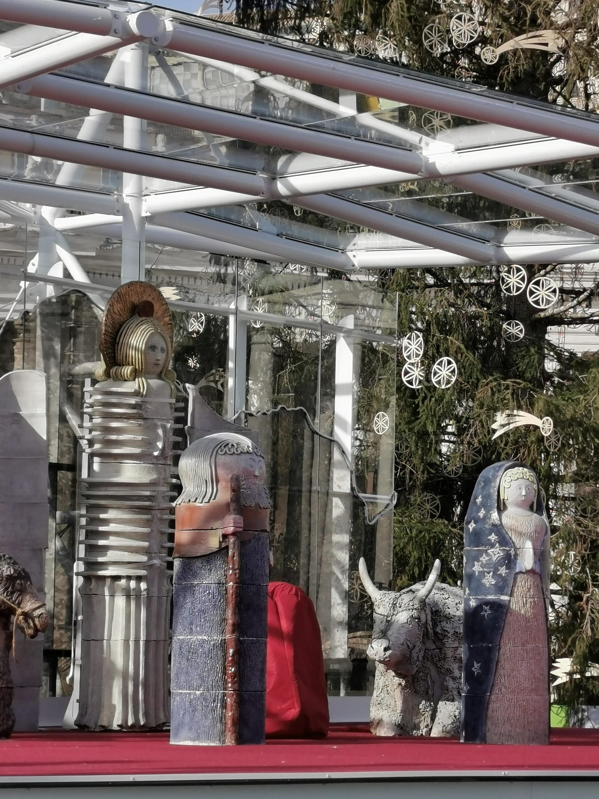 Unveiled last week, the scene features 19 life-sized, cylindrical ceramic figures of the usual suspects — Mary, Joseph, the three Magi, the Christ Child, sheep — as well as two comparatively contemporary visitors: an astronaut and a staff-wielding character that some have likened to Darth Vader from Star Wars.