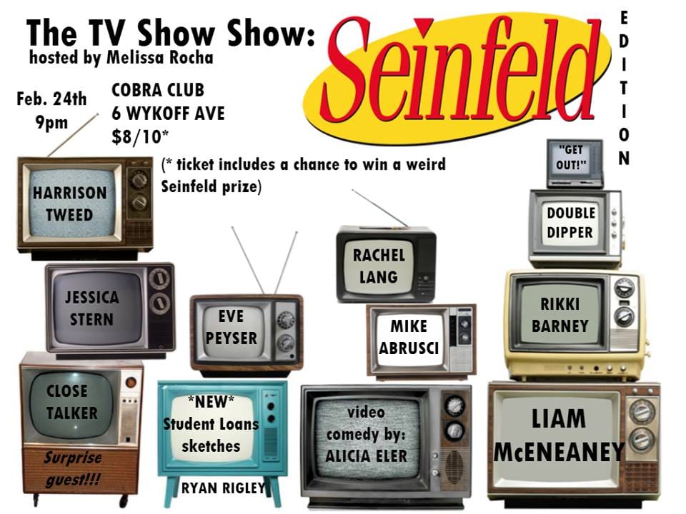 Melissa Rocha is a stand-up comedian who also hosts The TV Show Show, a themed comedy variety show. (Full disclosure: Alicia Eler participated in the Seinfeld edition.) Rocha left her performance art career behind when she realized she was funny, and wanted to work on crafting jokes. We caught up by phone about her transition, and why it happened. “The part of comedy that most artists and people have a hard time with is the failure of it,” she said. “It is so brutal…the trial and error is a lot harder to get a grip on. In the art world, you can just explain it.”