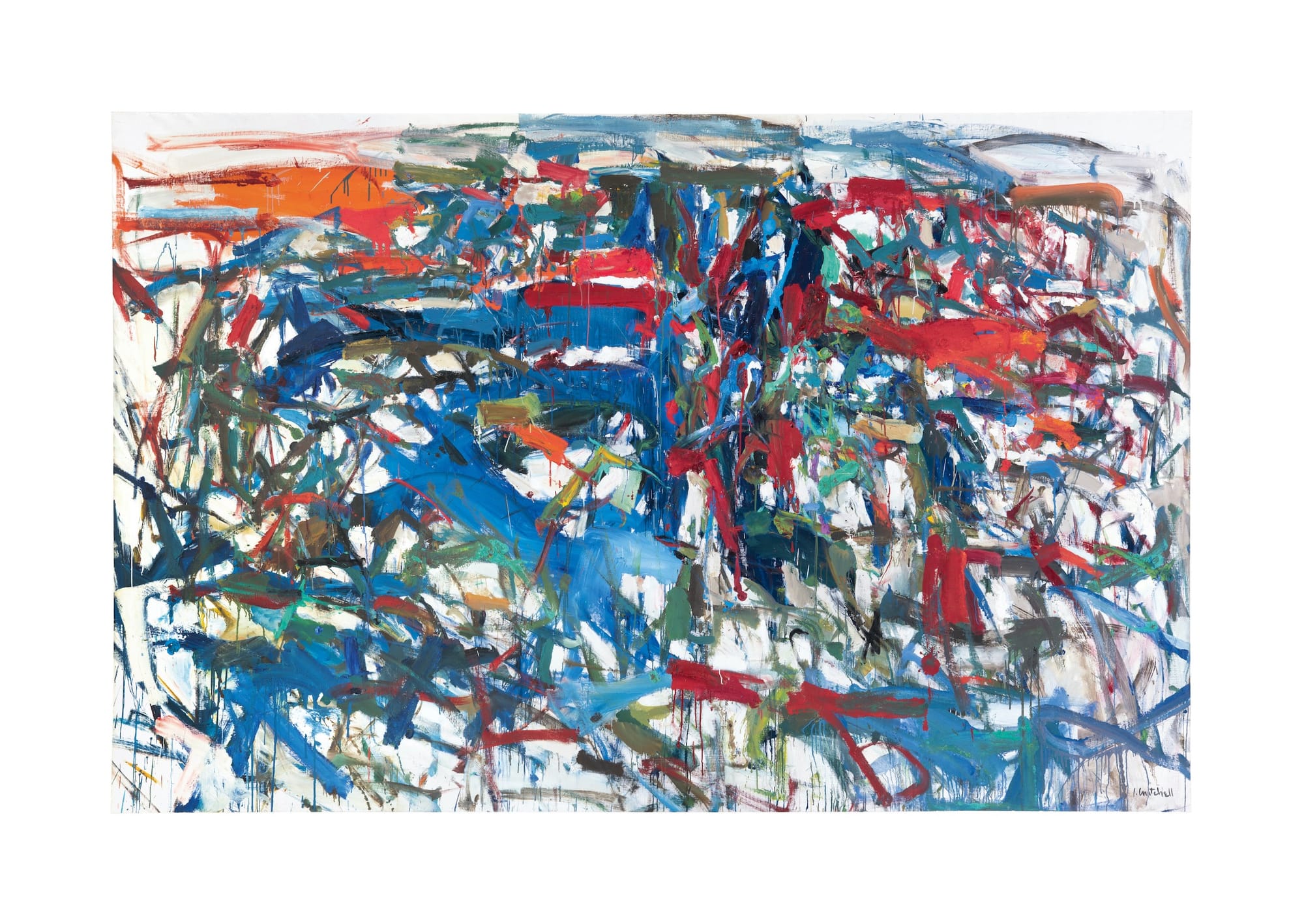 It only takes a few moments of being in the first gallery at the preview for the Joan Mitchell exhibition at the Baltimore Museum of Art for me to be reminded of a few lines from Sylvia Plath’s poem “The Night Dances”: “Such pure leaps and spirals — / Surely they travel / The world forever … ” Plath’s poem has other concerns besides how something or someone might find some kind of perpetual motion in our imaginations. But this passage rhymes powerfully with something that Mitchell herself said about the medium of painting. As Christopher Bedford writes in his foreword to the exhibition catalogue, quoting Mitchell: “Music takes time to listen to and ends, writing takes time and ends, movies end, ideas and even sculpture take time. Painting does not. It never ends; it is the only thing that is both continuous and still.” Mitchell’s painting is that: continuous, still traveling the world.