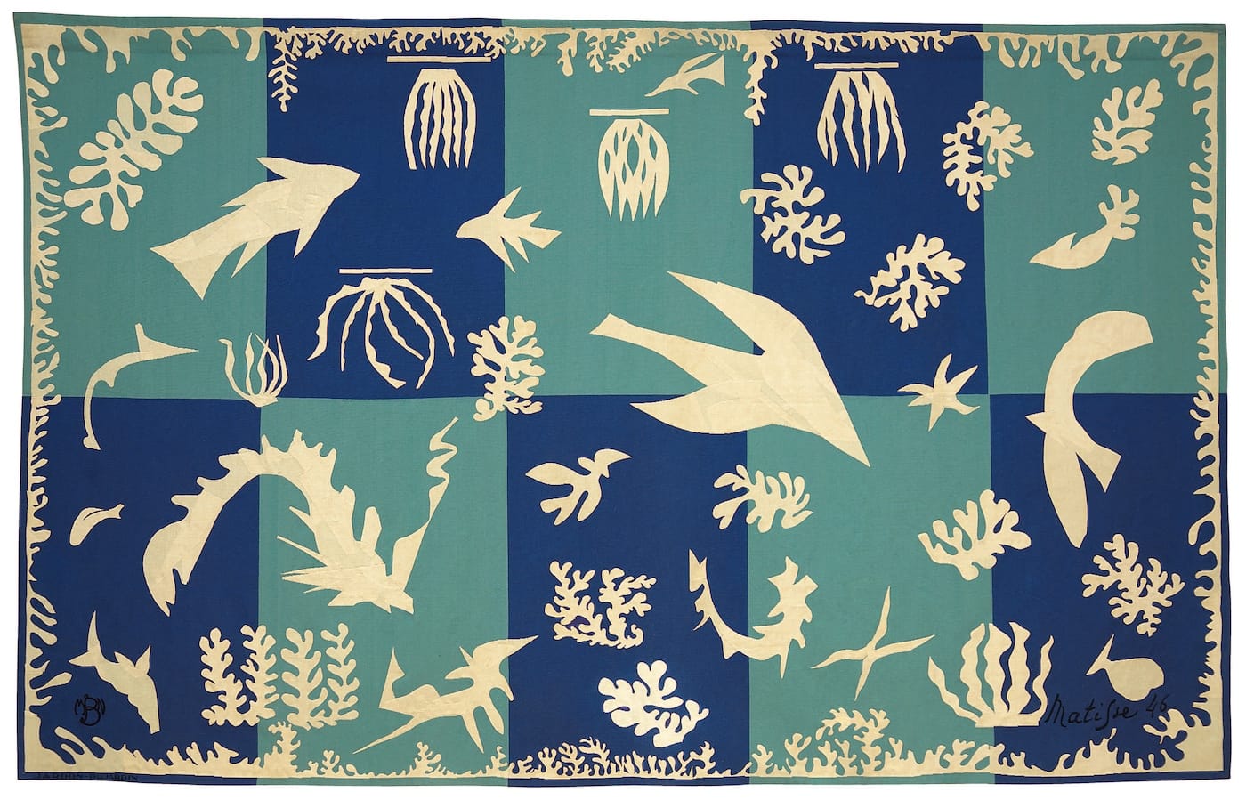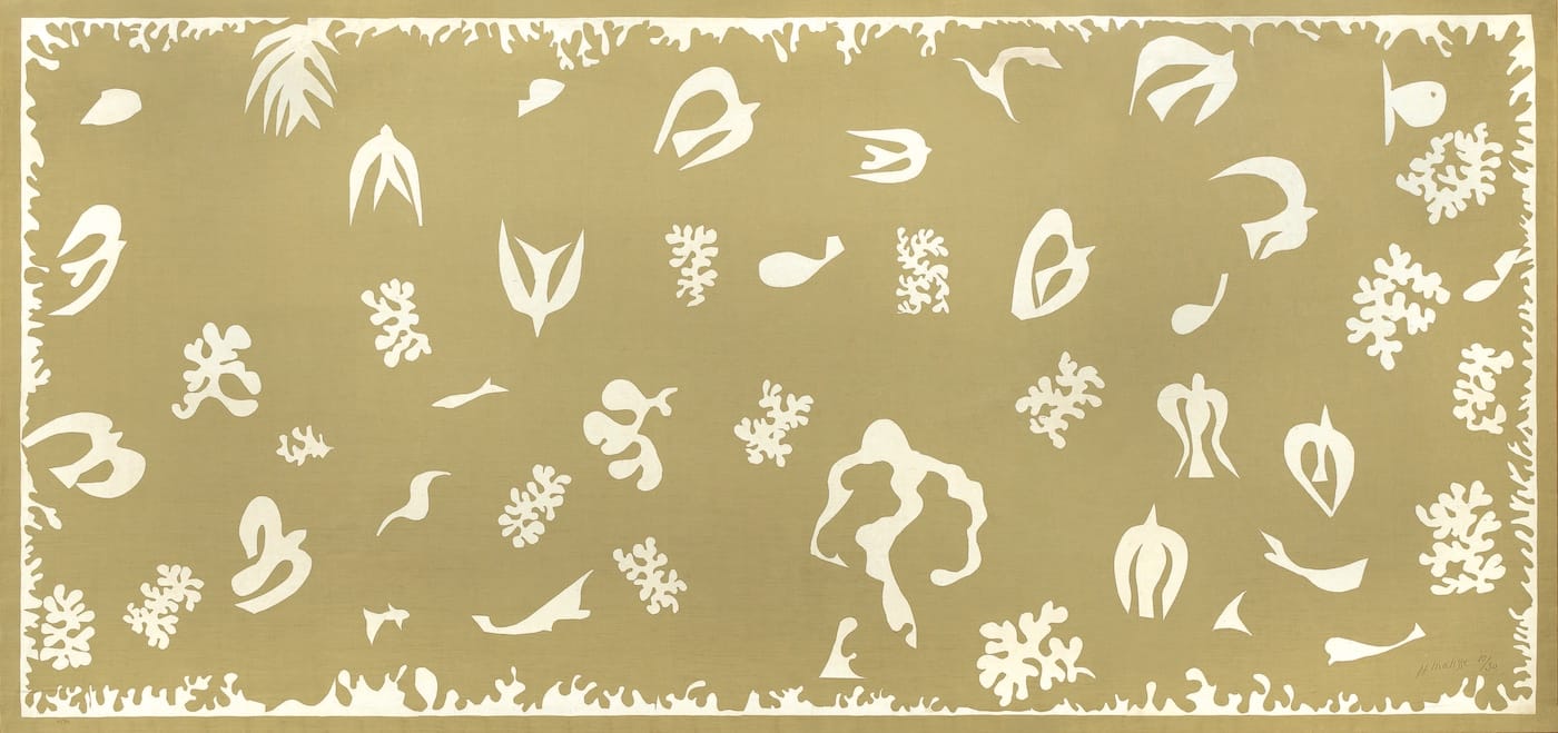 The postwar years offered Matisse new opportunities for both decorative painting and the production of decorative products on his design — textile goods including wall hangings and scarves, for instance. These fabric works were not, for the artist, insignificant. As he lectured the manufacturer, “Think that you have an important work of mine, destined for renown. […] You are making something that will need to be respected as much as an artistic engraving.” There were also efforts to market what another manufacturer dubbed “mural scrolls”; perhaps precisely because of their inherent ambiguity (they were meant to be used either as fabric wallpaper or to be hung individually in the manner of Asian scrolls), they never sold in any numbers.