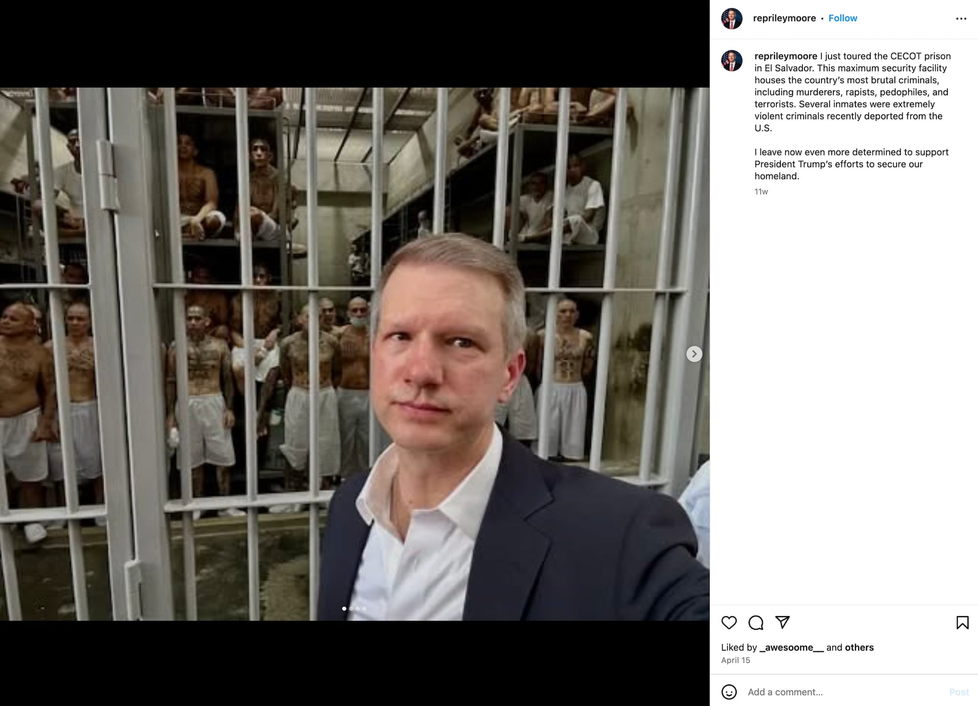 Representative Riley Moore, a Republican from West Virginia, also visited CECOT and got a tour of the prison. But he opted to take a selfie during his visit in April, his blank face visible in front of a cell filled with shirtless tattooed men. In another photo in the same post, he gives two thumbs up in front of the cell, writing in the caption, “I leave now even more determined to support President Trump’s efforts to secure our homeland.”