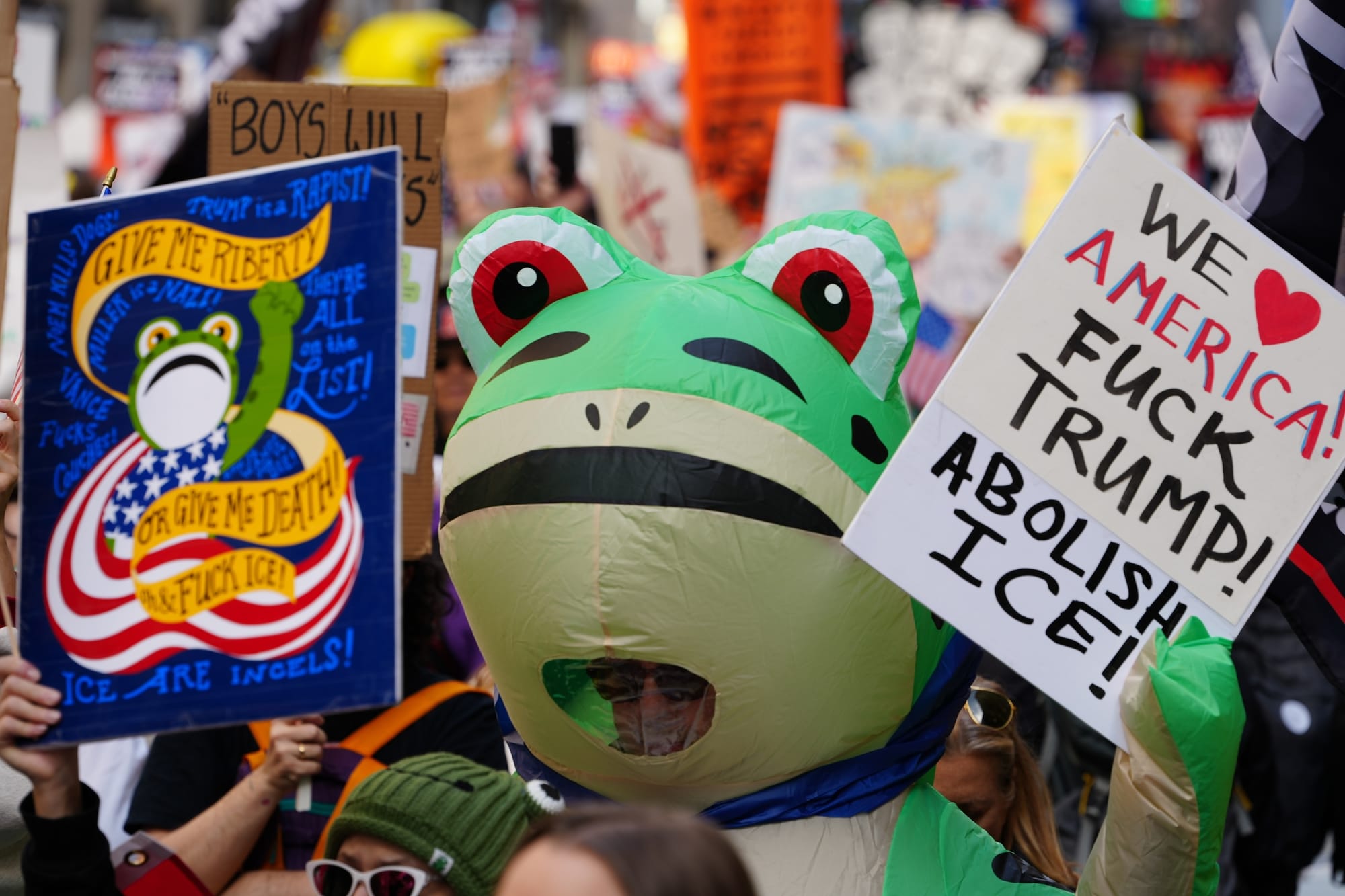 Then again, maybe the right is irked by the fact that Saturday's protesters assembled lawfully after the GOP spent weeks trying to vilify them as dangerous. House Speaker Mike Johnson — the same man who once referred to the January 6 Capitol rioters as “innocent” Americans who “just happened to be walking through the building” — derided the No Kings protests as a “hate America rally” attended by “the pro-Hamas wing.” Are those the same people who were gently gliding in inflatable frog costumes in a nod to the peaceful anti-ICE activism of Portland, Oregon? Just wondering.