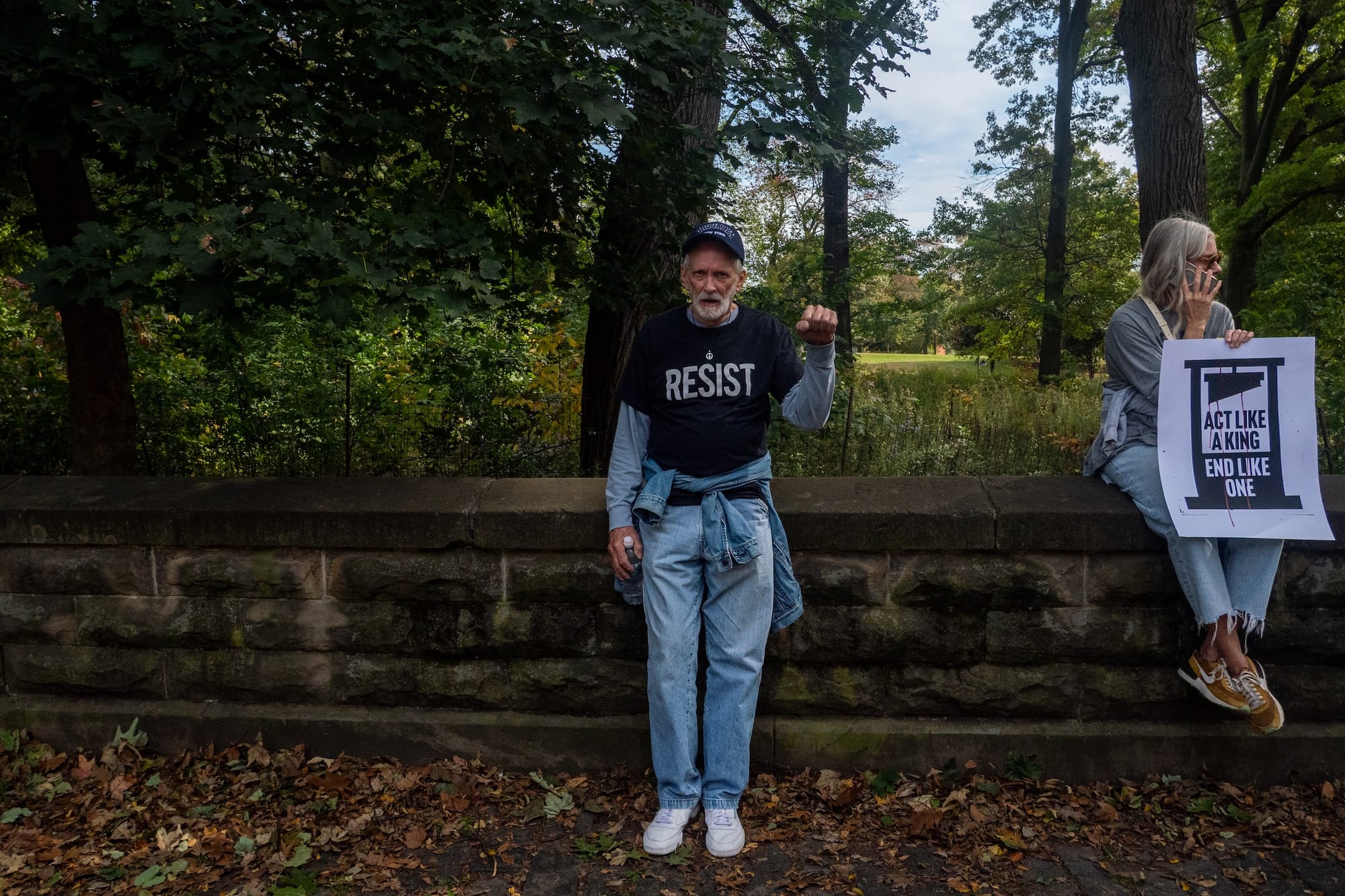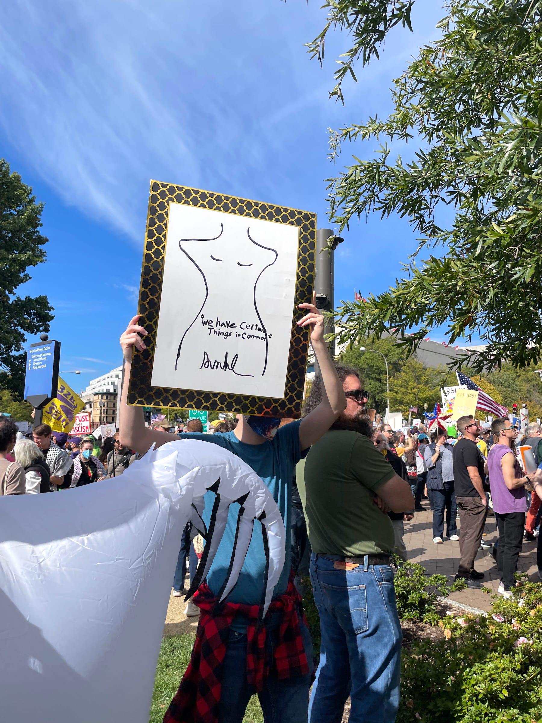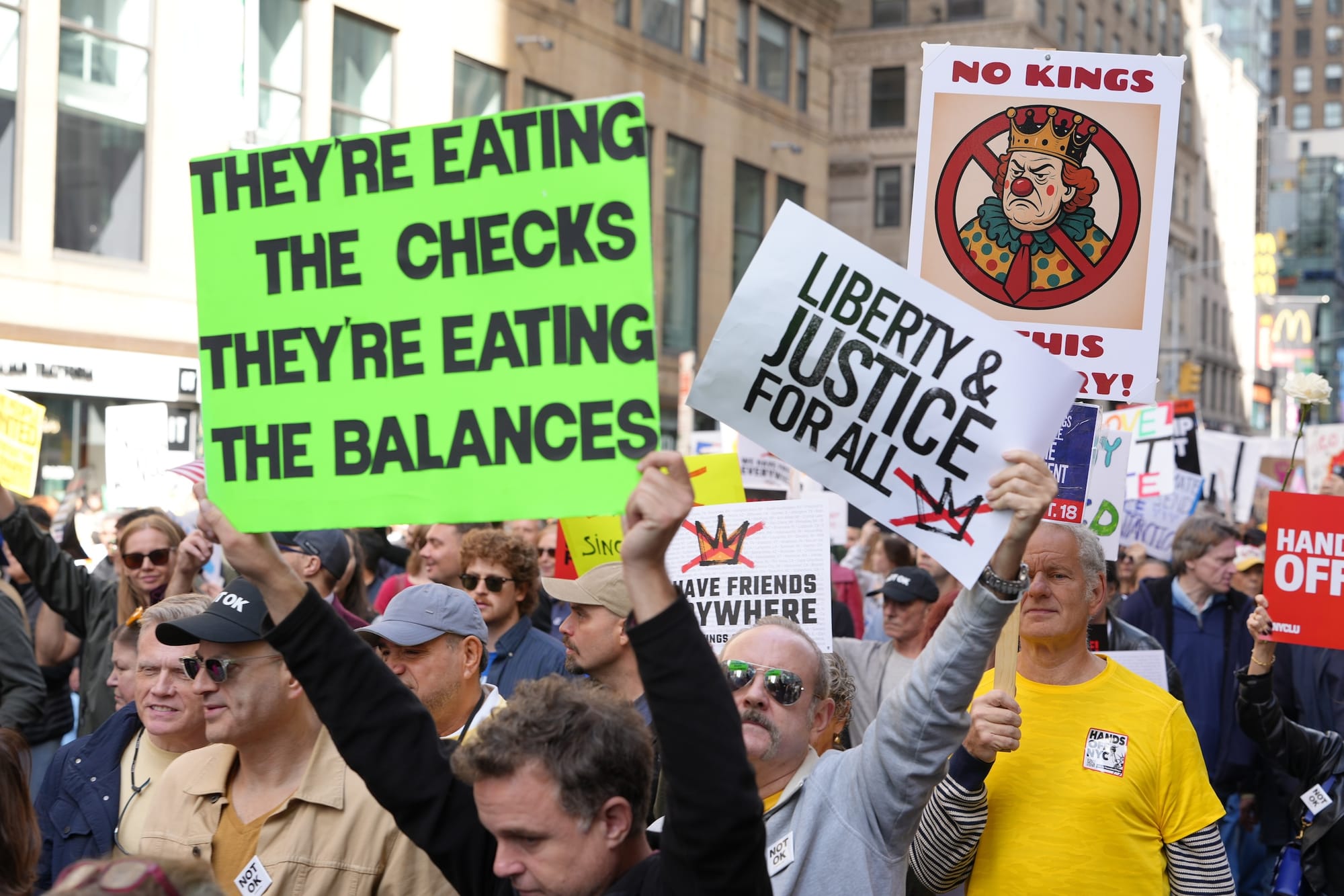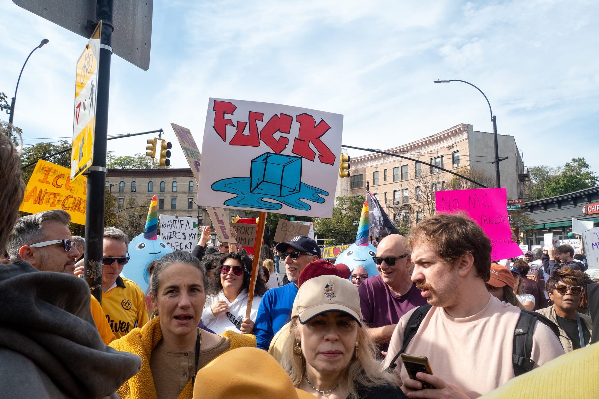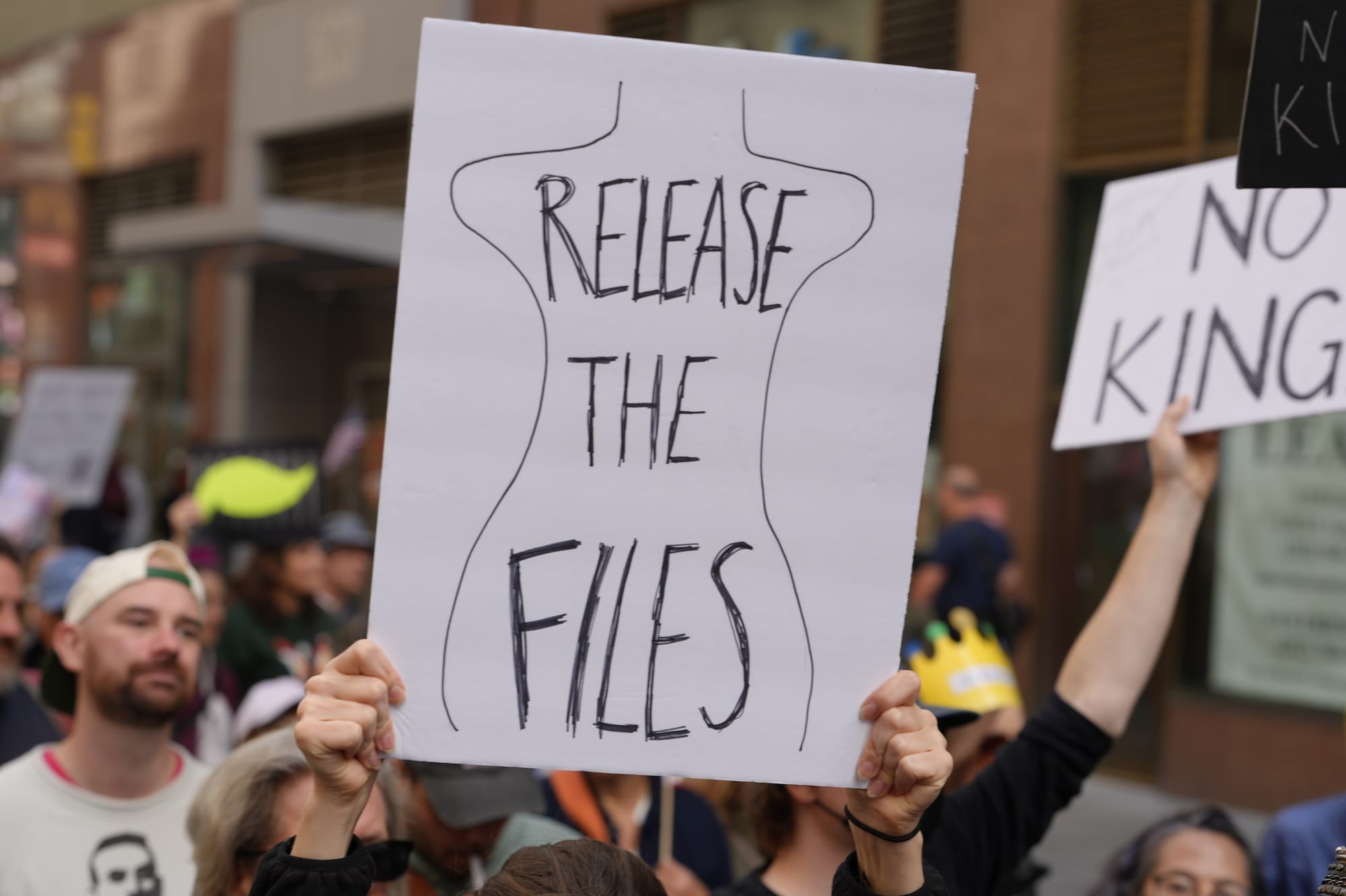 Or perhaps it's protesters' relentless calls for Trump to release the Epstein files — including one sign, photographed by Hyperallergic Editor-at-Large Hrag Vartanian in Manhattan, that invokes the president's own alleged birthday drawing for the convicted sex offender.
