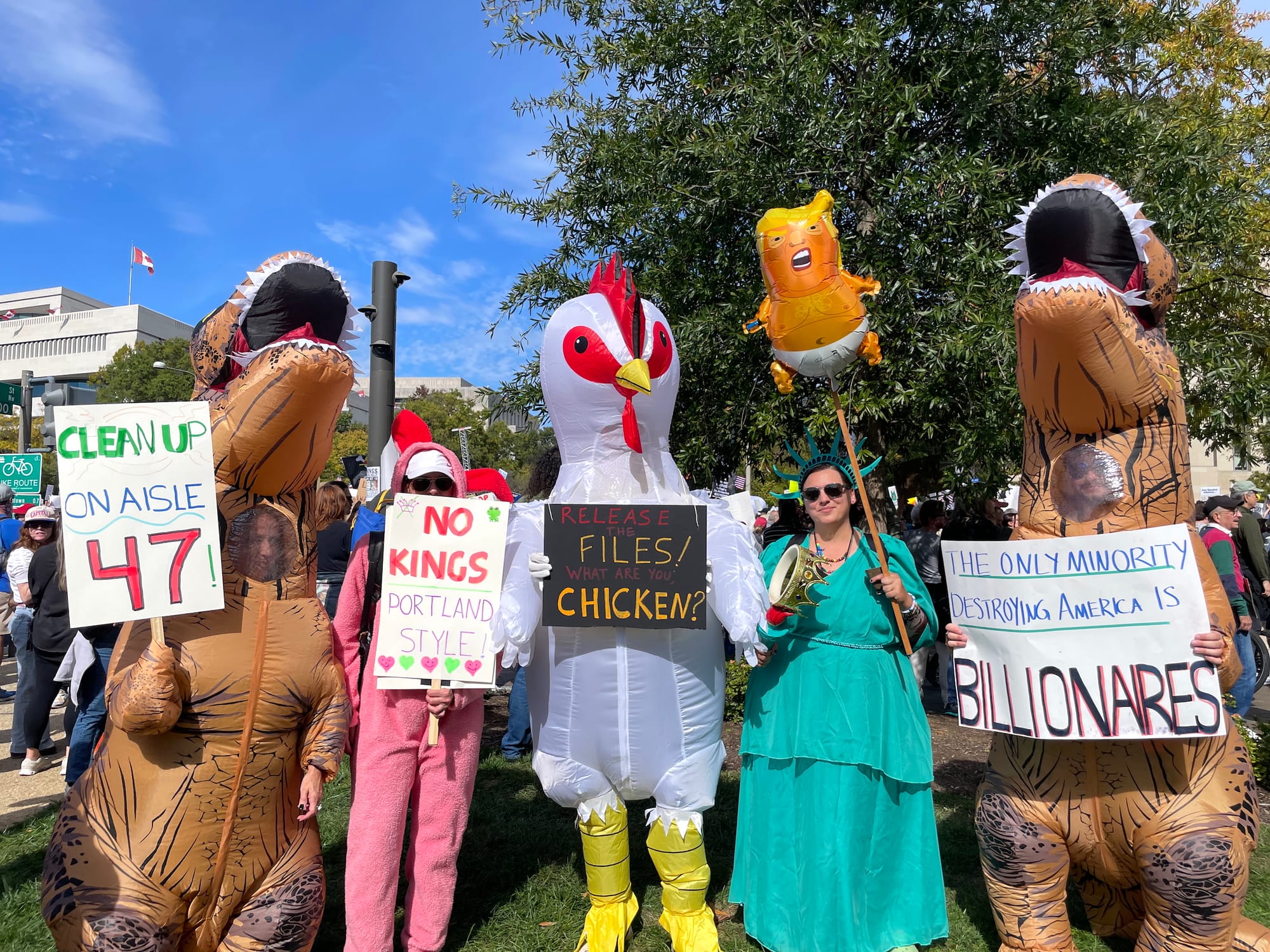 See some of the most creative looks and protest art from this weekend's No Kings marches below.