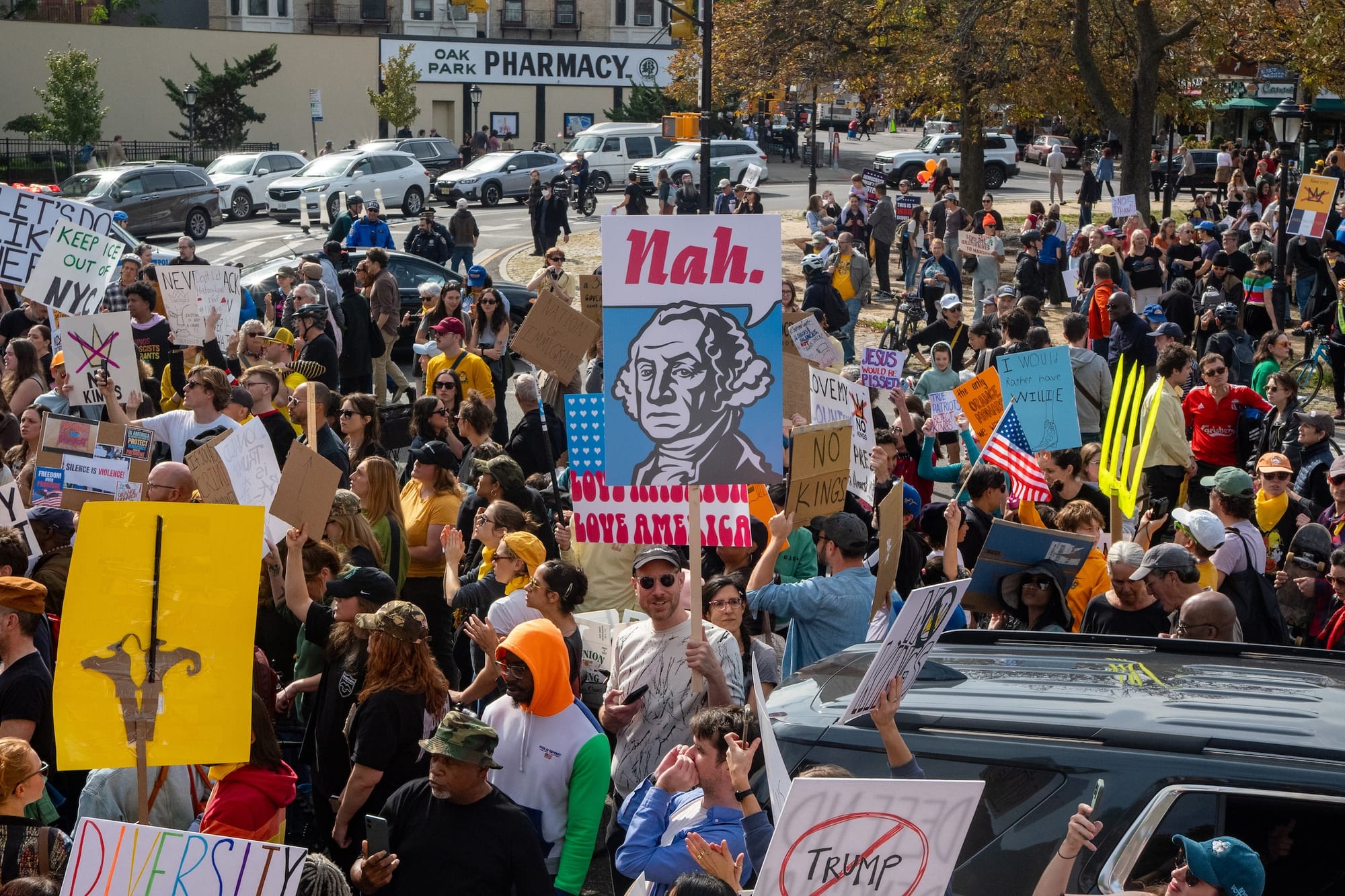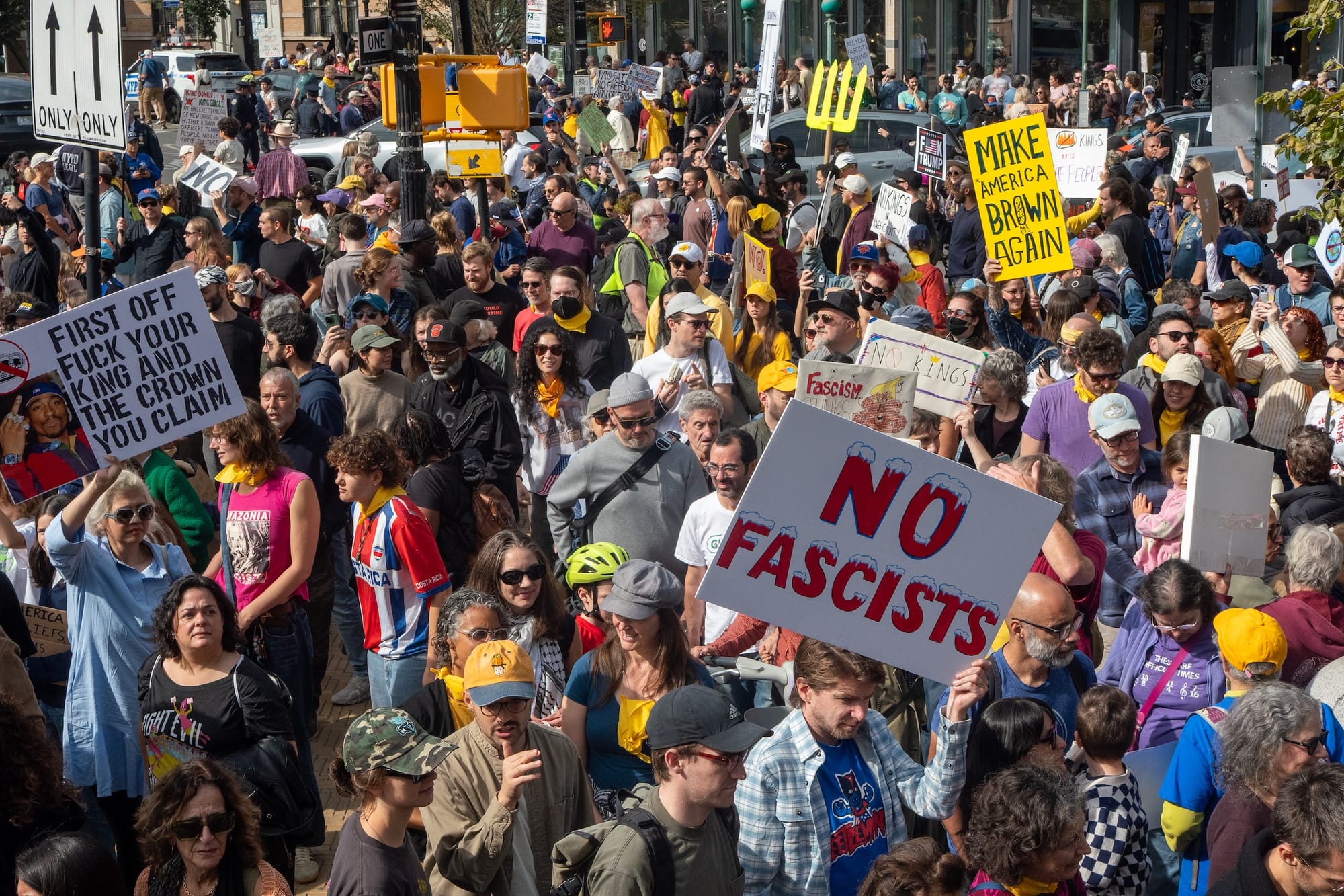Why is the movement so provocative to the right? It might have something to do with its “surprisingly patriotic” aesthetic, as Hyperallergic contributor Emma Cieslik observed from Washington, DC, where she captured marchers in head-to-toe Revolutionary garb and eagle costumes accessorized by US flags and copies of the Constitution that subverted Trump's jingoistic iconography. One sign depicted an exhausted George Washington warning against the repetition of history ahead of the country's 250th anniversary. It must sting for Trump, seeing the event he's tried to co-opt for his personal brand framed not as a celebration of American independence, but as a mourning of its loss.