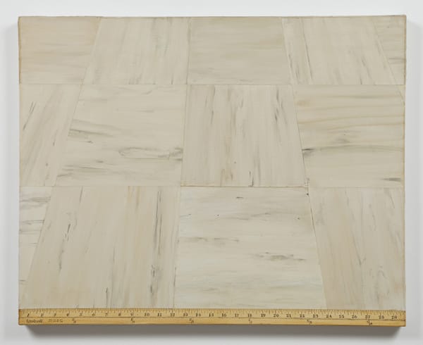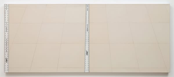 Meanwhile, behind the rulers, the square linoleum tiles are rendered to appear parallel to the top and bottom edges of the painting, while converging inward. Their adherence to the logic of single-point perspective further suggests a backward spatial movement, this one more conspicuous than the dividing ruler. Historically speaking, Plimack Mangold’s tilting linoleum tiles date back to the exploratory period of Early Renaissance, when rudimentary perspective was in the process of becoming codified.