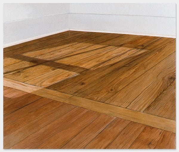 In addition to pushing back against the flatness that Clement Greenberg insisted was absolutely integral to painting, Plimack Mangold also distinguished herself from the painterly realists, such as Fairfield Porter and Alex Katz, whose work the poet-critics associated with the New York School championed. Like Porter and Katz, Plimack Mangold was an observational artist, but she never became a social painter or a portraitist — there are no people in her work. In addition, her preoccupation with exactitude led her to become meticulously attentive to the grain, knotholes, and coloring of a wooden floor, the slight color shifts in linoleum, and the effect of diffuse light on white walls. Moreover, in both the wooden and linoleum floor paintings, Plimack-Mangold went a long way toward dissolving the boundaries between representational and abstract painting.