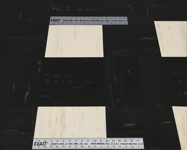 Instead of being outside the scene and looking in, as we are in a genre picture like Gustave Caillebotte’s “The Floor Planers” (1875), we are literally brought inside the space — a condition even more precisely articulated by Plimack-Magold’s “Two Exact Rules on a Dark and Light Floor” (1975), where our physical presence is acknowledged by the position of the rulers, which suggests that we might be checking whether the tiles are correctly aligned.