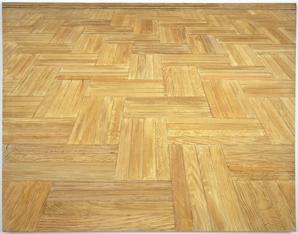 Plimack-Mangold’s wooden and linoleum floors tilt back in space. Their low viewpoint conveys the sense of being on one’s hands and knees, stopping now and then to look up, and survey the immediate surroundings. Although it is never clear why the viewer is in this position, the inclusion of the two long metal rulers in “Exact and Diminishing” (1976) suggests an equation between painting and labor, in this case the laying of linoleum panels. In each practice, one covers a surface with modular units that result in a grid. Painting and making a floor are not only equivalent, but foundational — each become the ground on which we walk, in our culture and in our home. Rather than transporting the viewer elsewhere, as Held’s painting started to do in the late 1960s, Plimack Mangold’s merging of subject matter and viewpoint opened up a space for self-reflection.