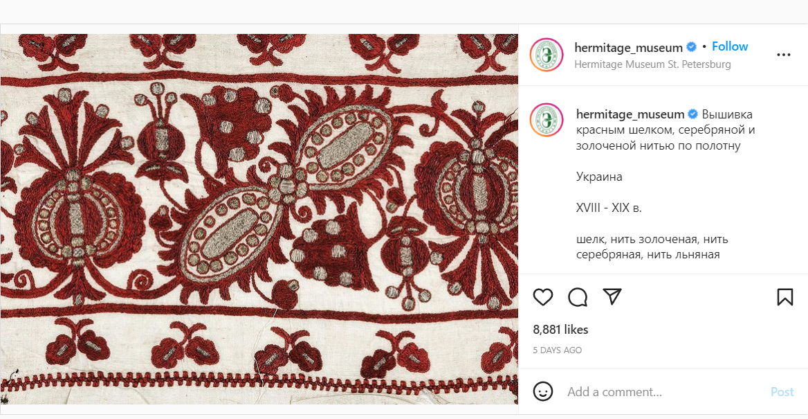 Here is an Instagram post of one of the biggest museums in the world, the Hermitage. “Red silk, silver and gilded thread embroidery on cloth, Ukraine, 18–19 century,” says the post. Some may interpret it as the gesture of supporting Ukraine (“good” Russians interpret it in this way), some as an imperial jeer, because neither the provenance of the embroidered cloth nor the context of this post is clear.
