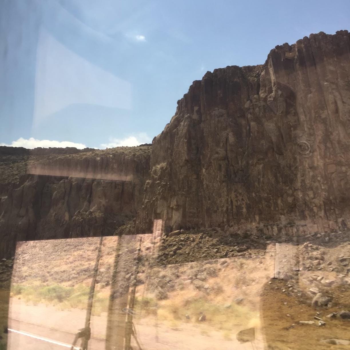 But by the time our bus was barrelling down Route 318 to arrive at Heizer’s Double Negative before sunset (and a threatening thunderstorm), most of the passengers — no longer the fresh, exuberant crowd that boarded some six hours ago — were asleep, lulled by a land art documentary playing on bus monitors overhead. We counted down the half hour before City’s approach in roughly five-minute increments: “It’s coming up on the right, get ready!” We hit the stretch of highway closest to City with little fanfare and with very few people other than us even glancing out the window. We saw a high, dark range of rock between our road and Heizer’s land some 30 miles away, which would have taken hours to reach had we attempted to travel on local roads. We didn’t stop.