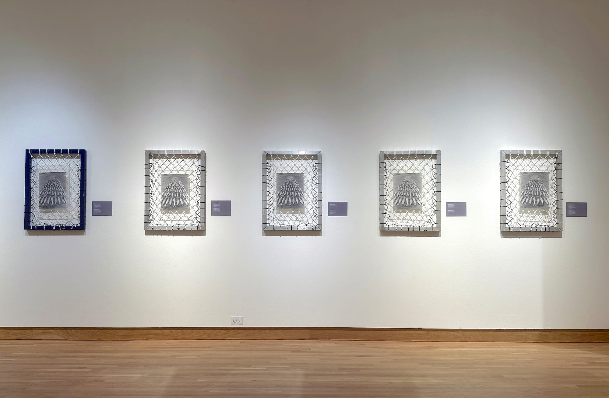 Texture, pattern, repetition, and practice combine with chance and the reality of climate change — will there be fish this year? — in Porras’s Da’-chvn-dvn series from 2023, five photographs that correspond to the number of bays used for drying smelt under the sun. The fish are arranged row by row, side by side, alternating head to tail on grass beds. It wasn’t until I examined installation images of the show that I realized the netting in the Da’-chvn-dvn works — attached to and stretched between all sides of each silkscreen frame, providing a support for the photos — is constructed with clover knots, countless wishes of good fortune. And with those knots, the artist forms a grid, bringing abstraction into the mix.