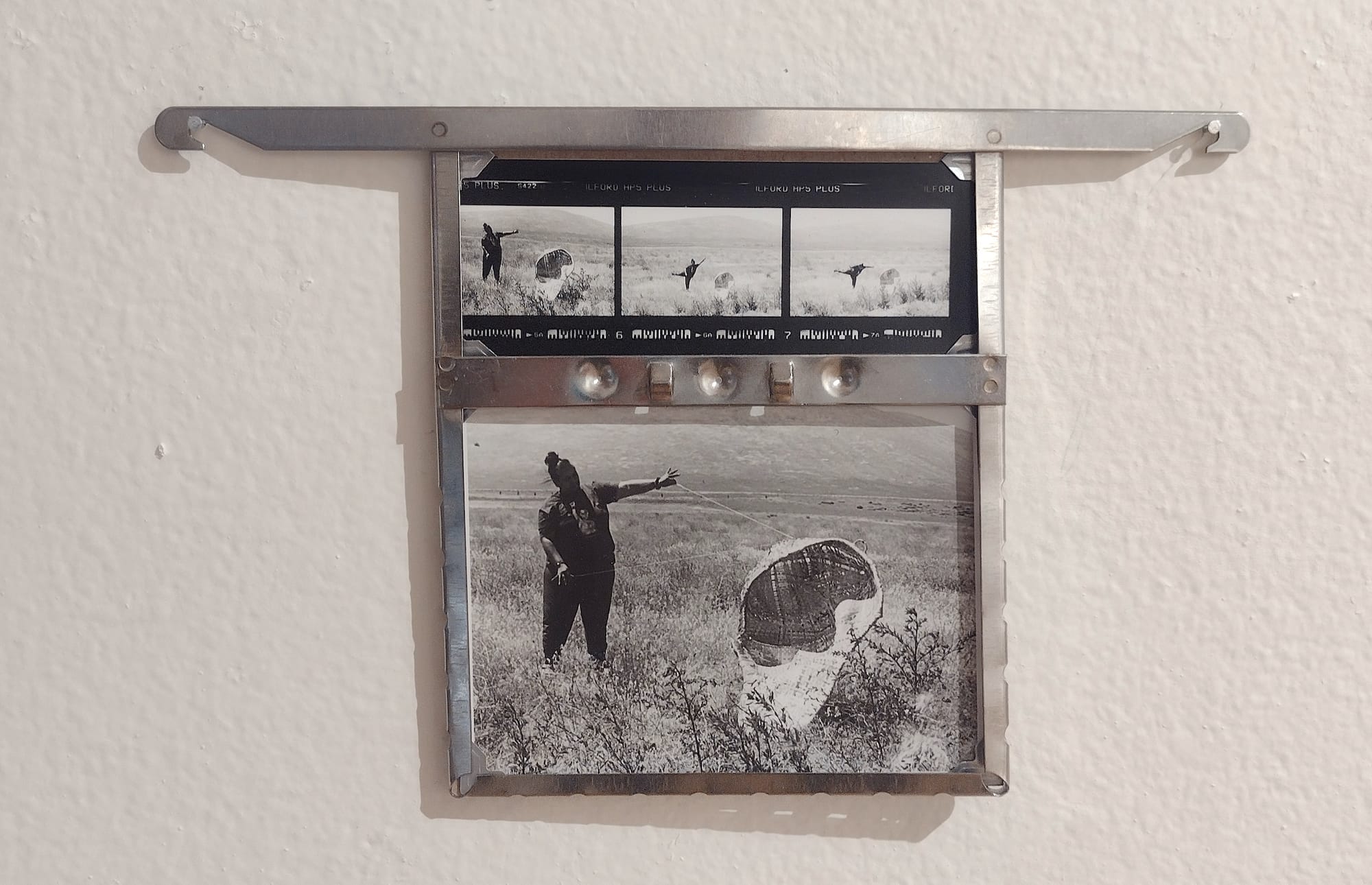 In addition to the photographs of the fish camp, Silvery Synthesis features images of a family burial in Texas and scenes from the Sacramento Valley. In particular, I haven't been able to stop thinking about “Yaya and Madboy / Tehachapi Mountains'' (2024). In the photo, the artist’s sister, Andrea Porras, dances in the Tehachapi Mountains of California with a sculpture of a buffalo ear made by Madelynn Boyiddle (Kiowa). Alone in an open field, she holds strings attached to the sculpture, reaching her arms up and out, with one leg stretched behind her. Bending at the hip, her body becomes parallel with the horizon as her other leg grounds her movement, maintaining a connection between the land and the sky. The photo is one of many portrait-like images framed in individual film developer hangers, arranged in parallel groups of four and displayed in stepped formations on the wall. Similar to the netting in the Da’-chvn-dvn series, the repeated pattern implies a structure of support — in this case related to images of family, surroundings, and personal practices, traditions, and rituals.