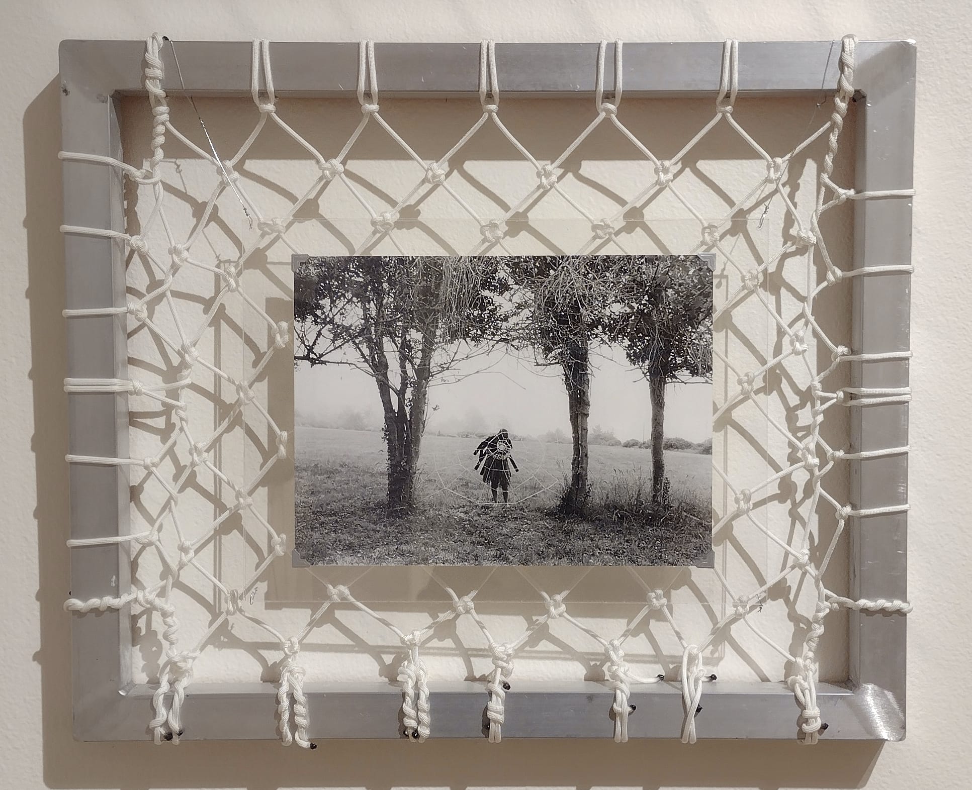 As the title implies, silver plays a central role in the exhibition, the artist’s first solo museum show since graduating with his MFA from the Institute of American Indian Arts last year. As a chemical component of the developing process, silver gives analog photographs that classic shimmery quality. As a color and its variations, the silver of Porras’s frames, the black and white netting, and the gray shadows on white walls together visually cohere the show. Repetition is suggested throughout, and I can’t help but think of how silver is also used to create a mirror by coating glass, reflecting back to us the cyclical process of looking, forgetting, and remembering.