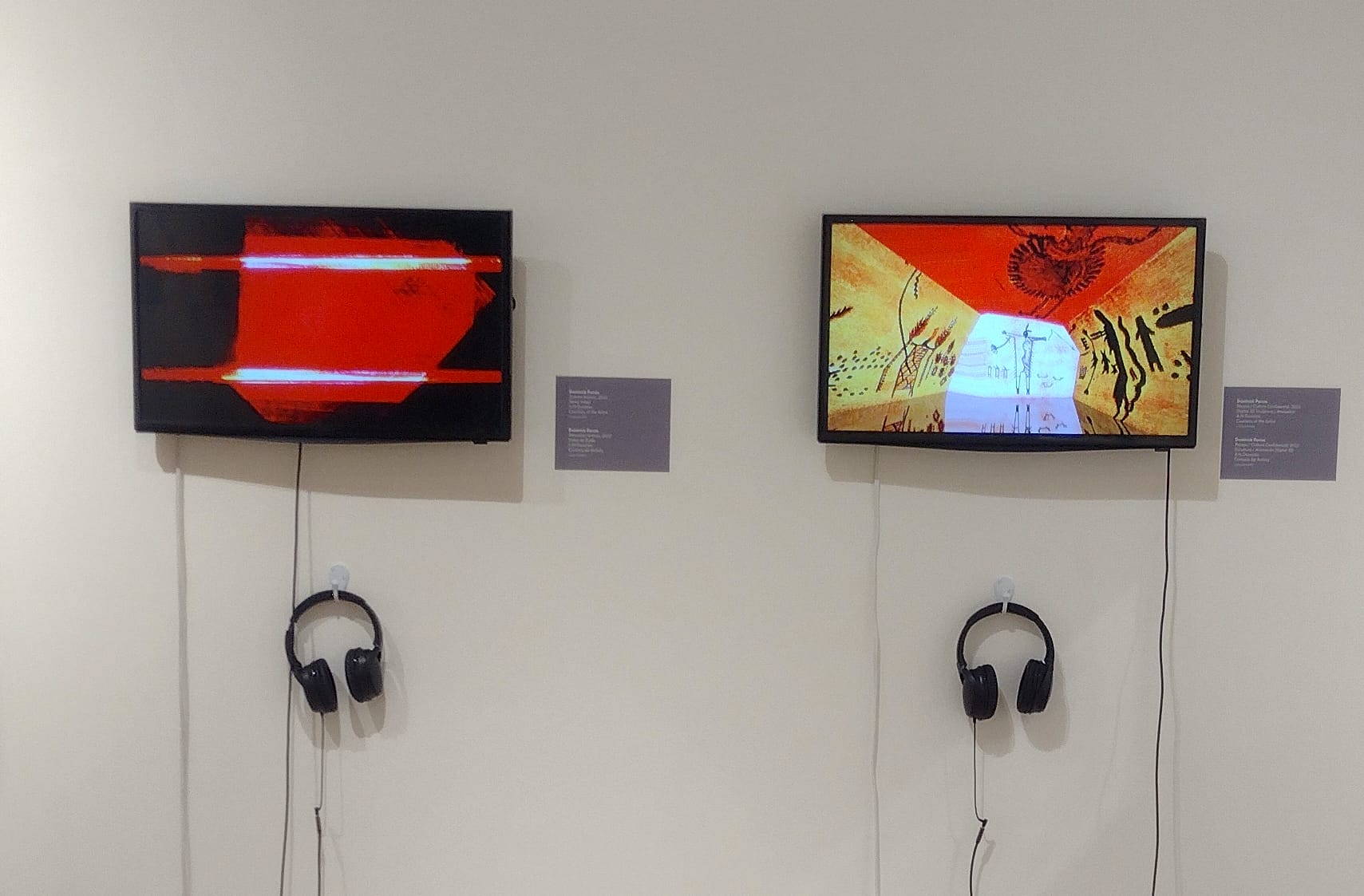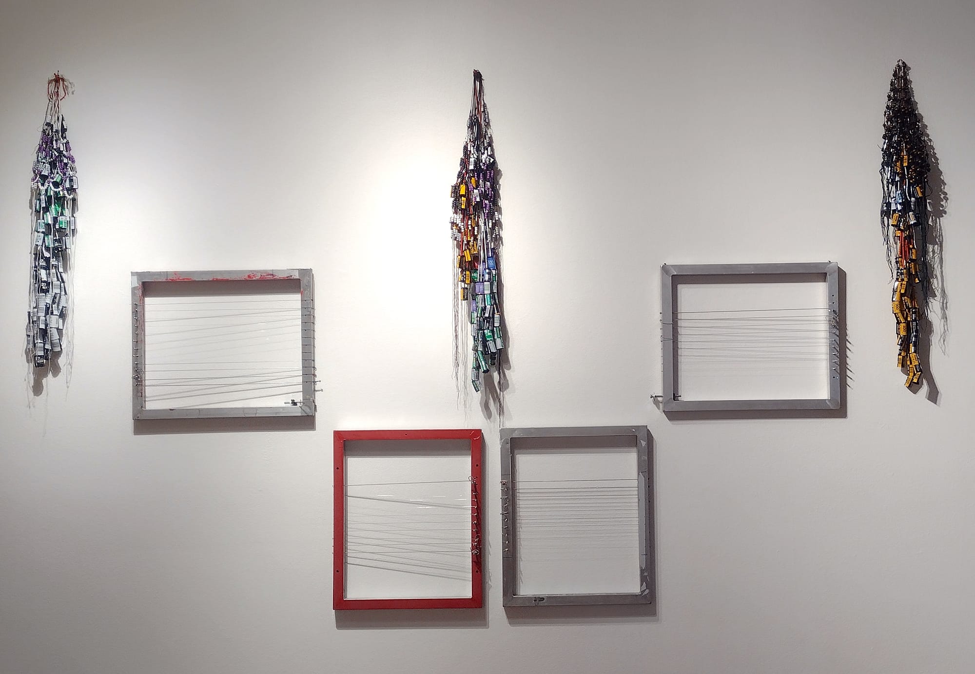 Also in the show is a grouping of Fallen Harps (2024), for which Porras again repurposed silkscreen frames, this time using guitar strings and pegs to create sculptures that double as musical instruments. By installing them alongside three-dimensional works made from 35mm film cassettes, paracord rope, and beads, the artist emphasizes how objects can be used for multiple purposes and brings together abstraction and rasquachismo, incorporating whatever materials are on hand.