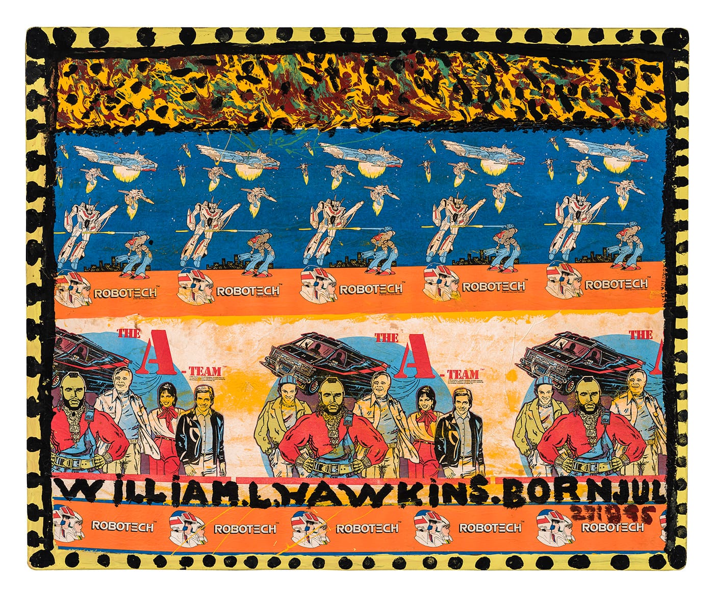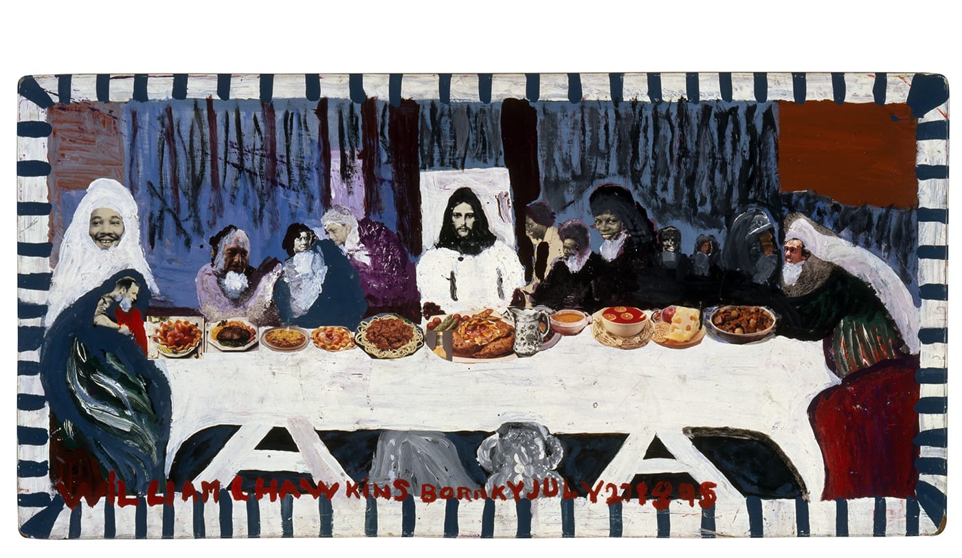 The twists and surprises in this exhibition never stop coming, including the 3D sculptural work that anchors the second gallery — one of the few large-scale constructions that was salvaged from the dilapidated art-house-complex that Hawkins purchased as his home base with his first sales in the New York gallery scene. The third gallery contains some ephemera from Hawkins’s studio, including his famous “research suitcase,” and a number of his collage-heavy works, as well as several more dramatic examples with snakes and an entire human figure hanging from one of the canvases. The exhibition terminates in a gallery entirely dedicated to his Last Supper series — there are eight of nine, most of which portray Jesus and his disciples as African American. It is difficult to pick a favorite, but the one that features a painted-over clipping of young Stevie Wonder in the role of Jesus is a strong contender.