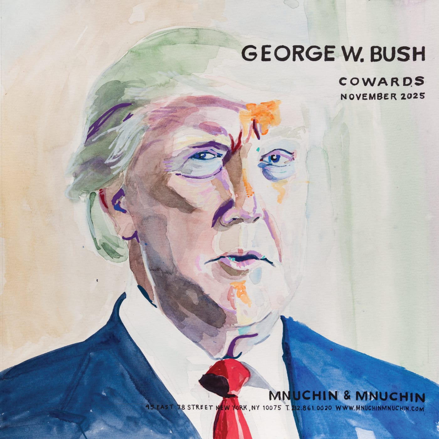 Mnuchin & Mnuchin Gallery is pleased to continue our 2025 season with George W. Bush: Cowards. Including more than one hundred paintings and drawings, the exhibition marks a major departure for the former president. Moving away from his deeply expressive portraits of heroic soldiers and powerful world leaders, his new series, Cowards, begun in 2016 and continued in private for nearly a decade, confronts us with portraits of every member of the Trump Regime.