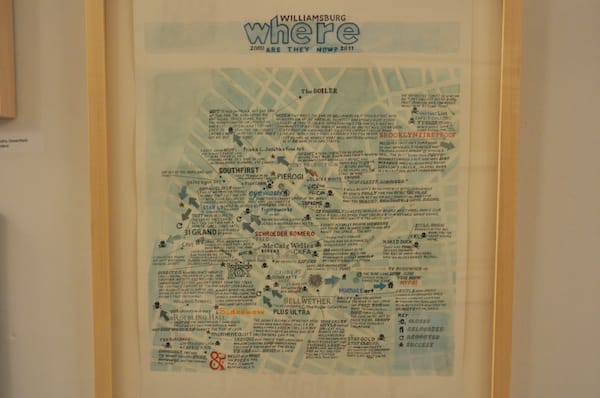 A detail of Ward Shelley’s large “Williamsburg Time Line” (2002) serigraph that is included in Williamsburg2002. It documents four decades of the neighborhood’s artistic history. The drawing was initiated at Walczak’s Eyewash gallery almost a decade ago. “He slaved over it all weekend with friends, artists & neighbors stopping by & all contributing to Ward’s ambitious (performance) documentation of the Williamsburg arts scene since the early 80’s,” he says. “As a serigraph it has found its way into four major museum collections including MOMA and the Brooklyn Museum of Art.”