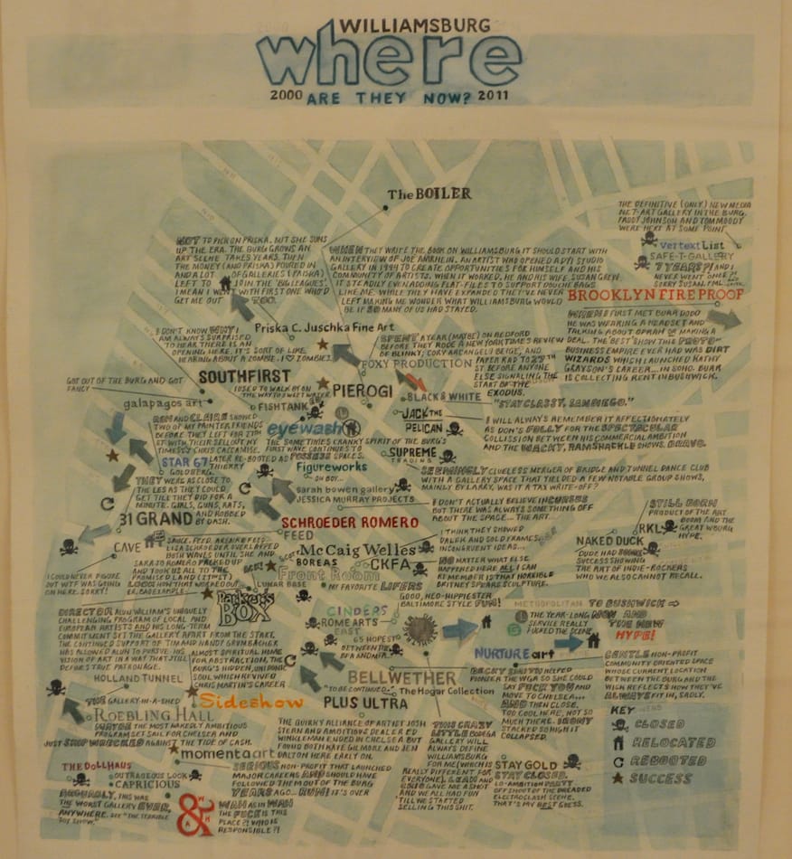 What killed the Williamsburg scene? There are many theories, including the fact that the L train was always under chronic repair every weekend throughout the aughts, which deprived the neighborhood’s galleries of visitors. “Ed [Winkleman of Winkleman Gallery] feels this drove a number of spaces to Chelsea & even the Lower East Side,” he says.