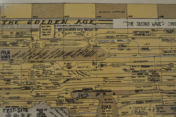 Ward Shelley’s “Williamsburg Time Line” (2002) dominates one wall in the front gallery.