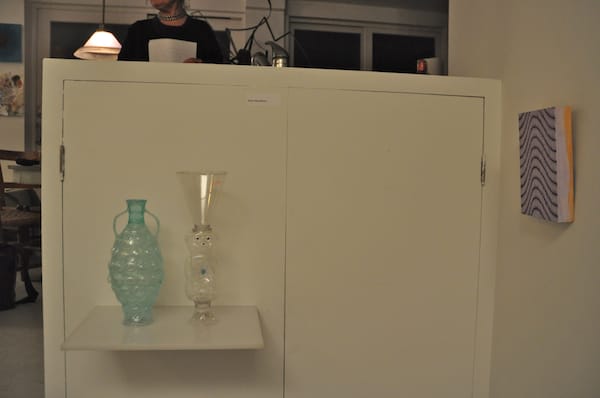 Shari Mendelson’s “Light Green Bottle” (2011) and “Honey Bear Vessel” (2011) and, right, Lori Ellison’s “Untitled” (2009) sit in the central space. The two have shown together before and complement each other’s interest in repetition and pattern.