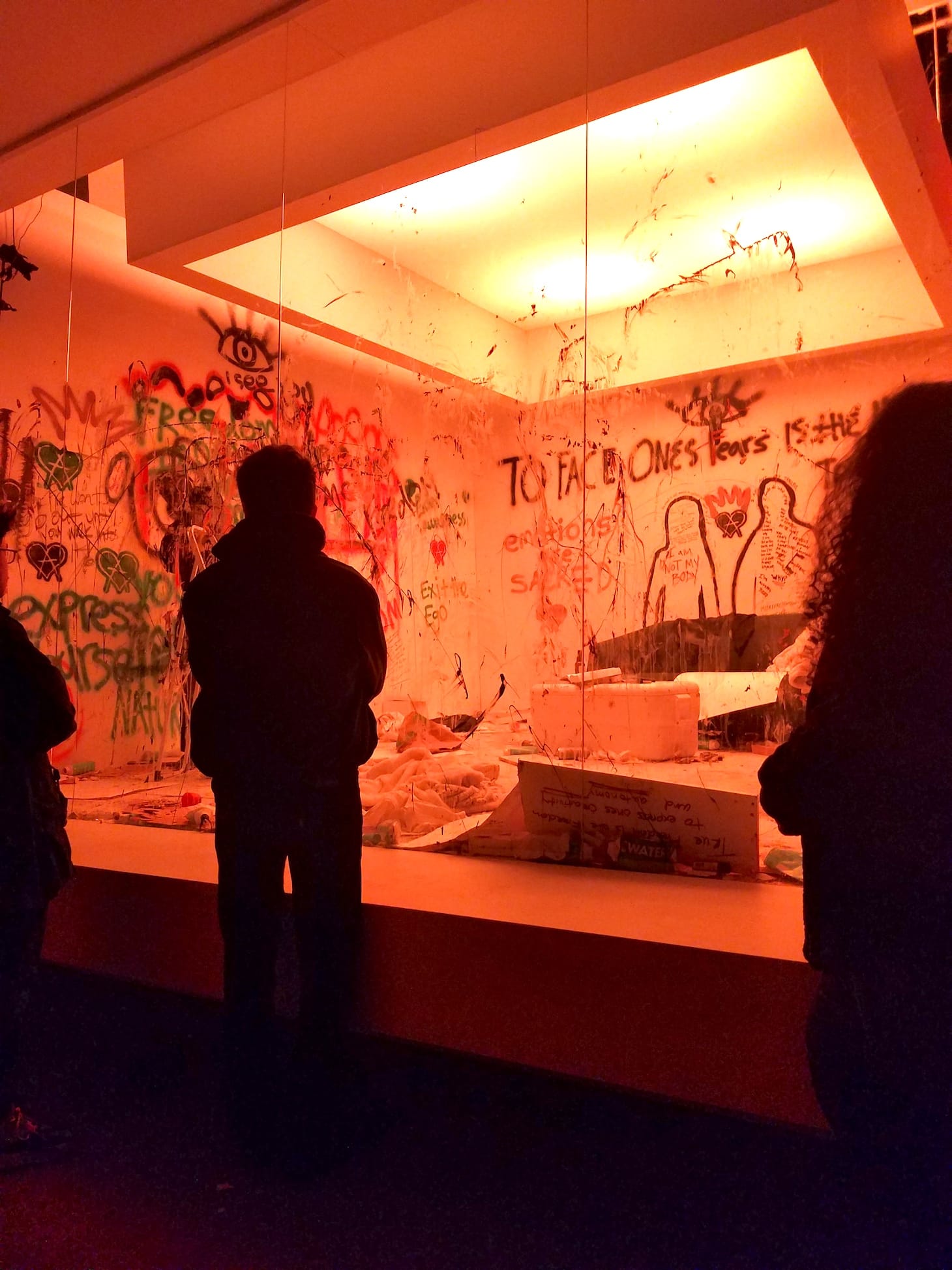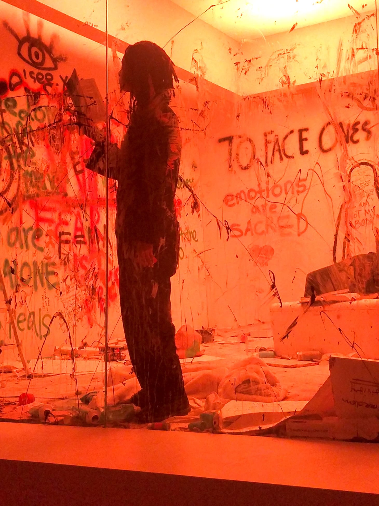 Visitors viewed the pair through a glass wall, as they cycled through the eight stages of anxiety, including rage, numbness, euphoria, and acceptance.