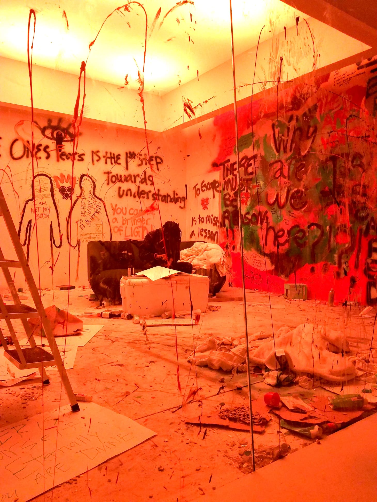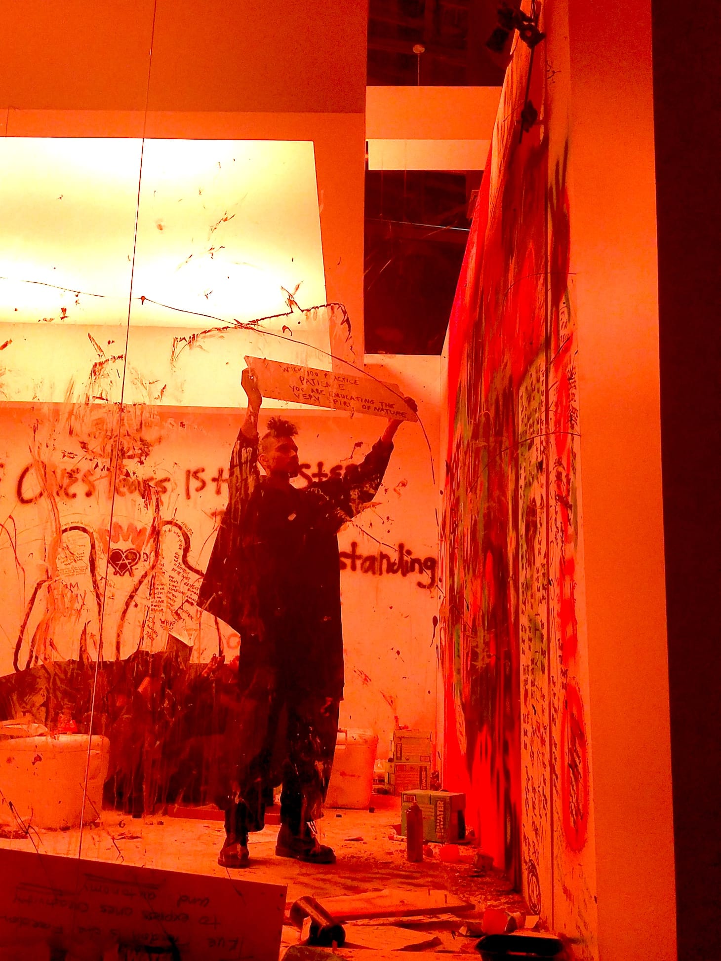 The creative duo premiered their newest project, “The Anxiety,” at the Museum of Contemporary Art’s Geffen Contemporary, where they spent a day locked inside the box, from 9pm Wednesday until 9pm Thursday. The exhibit — a 24-hour durational performance piece inspired by their personal experiences with anxiety — was not a part of MOCA’s programming; Smith and Cole rented out the Geffen. Free and open to the public, visitors viewed the pair through a glass wall, as they cycled through the eight stages of anxiety, including rage, numbness, euphoria, and acceptance. Each cycle lasted three hours and was accompanied by a representative color. Using the other three walls as their canvases, the room transformed into a living testament of their progression from blank fear to vibrant reconciliation.