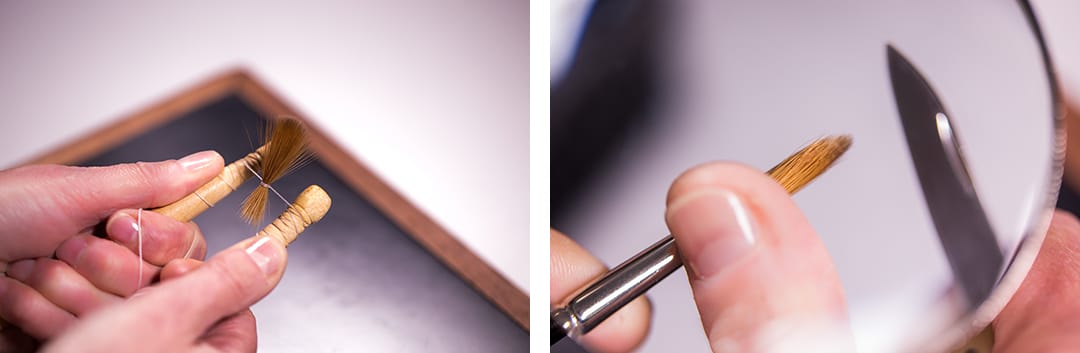 Once complete, the brushes – made in 13 different sizes, from 000 to 10 – are inspected under a magnifying glass to make sure no there are no broken hairs, or ‘blunts’. Finally, they’re tested with the same uncompromising precision, so the makers are certain each one offers the even colour and flowing, gestural strokes that have been prized by artists for more than 150 years.