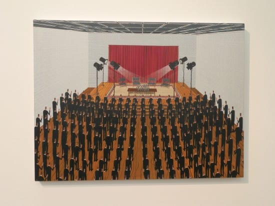 Perhaps the most successful works in the exhibition were the two paintings by Ian Davis depicting business people as suits without faces or any identifying feature like a mob of little Don Drapers from the television serial, Mad Men. Looking at “Conversation” (2011), I appreciated the humor in naming a painting conversation that represents a crowd of faceless men watching a stage with four chairs as if it were set up for a lecture. It appears to post the question, has a conversation become completely one-sided? Certainly, conversations between corporations and the everyday lives of Americans are set up in this manner. Davis’s critique of the definition of conversation could not only apply to these faceless corporations and drone-like workers but also to the power dynamics in many fields, such as academia.