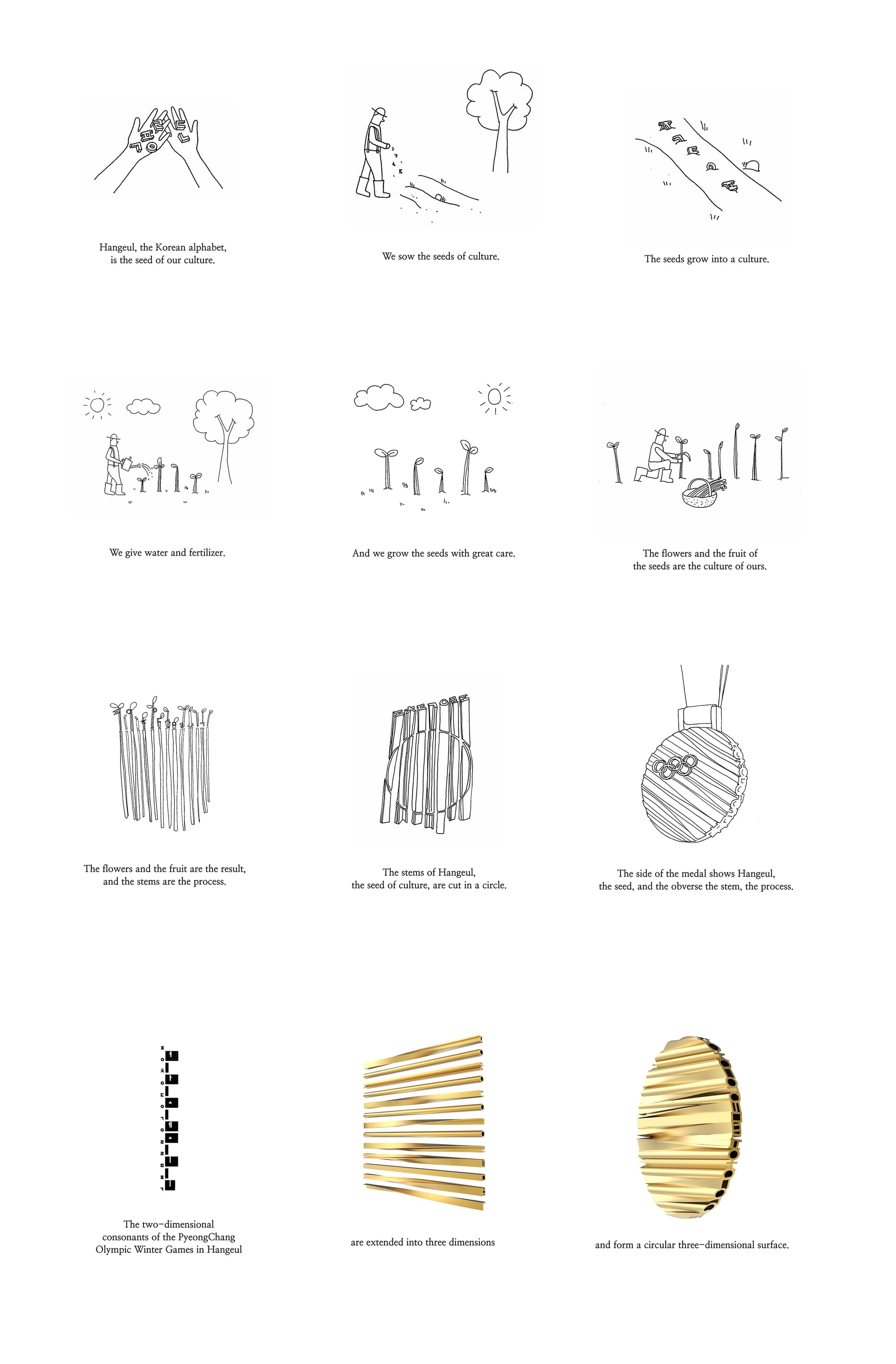 The medals hanging around winning athletes’ necks this year take their inspiration from the Korean alphabet, as well as from traditional clothing and architecture. In a poetic illustration Lee provided Hyperallergic, the designer presents the alphabet, Hangul, as “the seed of our culture. We sow the seeds of culture. The seeds grow into a culture.” Once the seeds are fully grown and the flowers and fruit picked through, what’s left are the stems — “the stems are the process.” These individual “stems” of culture are then bunched together and cut into the circular shape of the medal, creating a bumpy surface but cut so you can still read the individual letters on the side. As for the traditional Korean clothing and architectural motifs, those come into play in the ribbons, made out of the same fabric as hanbok, and the upturned eaves of the wooden medal cases.