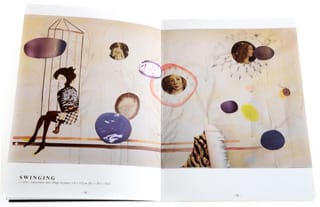 Paging through the catalogue eyeballs seem to float, suspended, through most of the paintings like some kind of eerie, disembodied symbol of sight and knowledge; reindeer with human faces are hunted by cowboys with guns; five figures float through the air, engaged in oral sex, next to, rather than on, a lovely spiral staircase; fashionable women are suspended, upside-down by chains, beneath oversized horseshoes; a mustard colored cloud drips a yellow substance onto three stick figures standing beneath it; cat-like animals hang like ornaments from the branches of a brown tree.