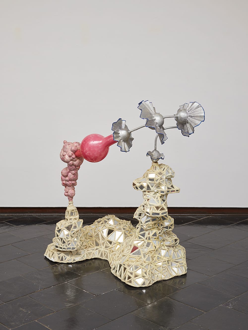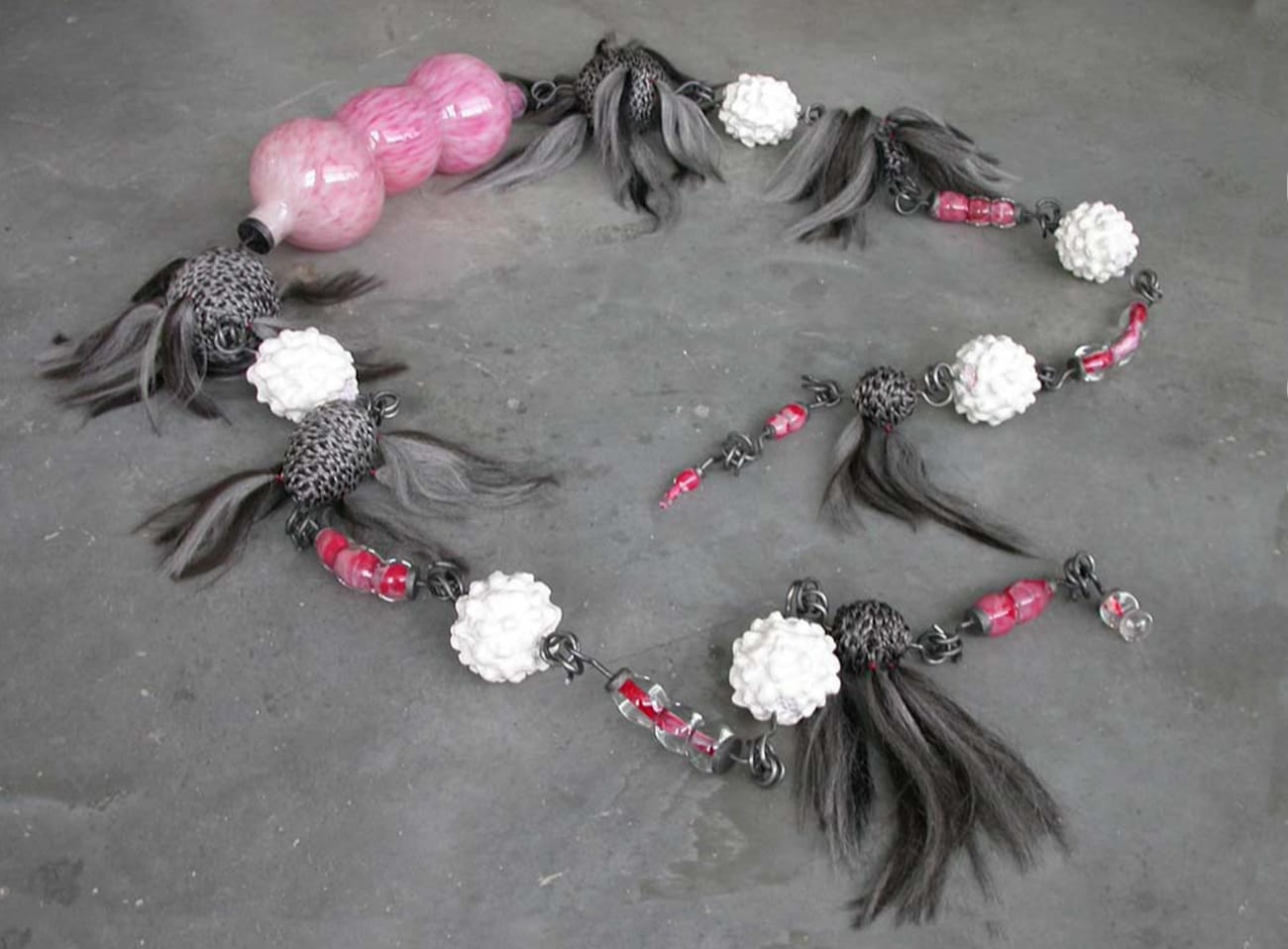 Sometimes a Body Is Not Just a Body includes sculptures in which materials sit uneasily in relation to each other: curvaceous blown glass forms atop or alongside ceramic and found objects like giant conch shells, hair, and in one case, a tortoise shell (retrieved, once again, from her father’s effects). "Teraton Necklace" (2003), referring to a grotesque tumor that grows hair, is a long, ungainly chain of visceral pink and red blown glass; white ceramic balls with undulating surfaces, recalling a molecule or a sea creature; and swatches of gray hair. The entirety is connected with steel links and rests loosely on a low plinth. Other pieces are more contained, forming vertical constructions from which long braids seem to grow. In the first decade of the 2000s, Bowen produced open structures that look as though they could be found in a fantastical garden. Especially lovely is "Exalt" (2007), a Gaudi-like pedestal studded with mirrors that sprouts a vine blooming resin ruffs. Bowen demonstrates a penchant for bright colors, with a particular love of pink, evoking both blood and feminine adornment.
