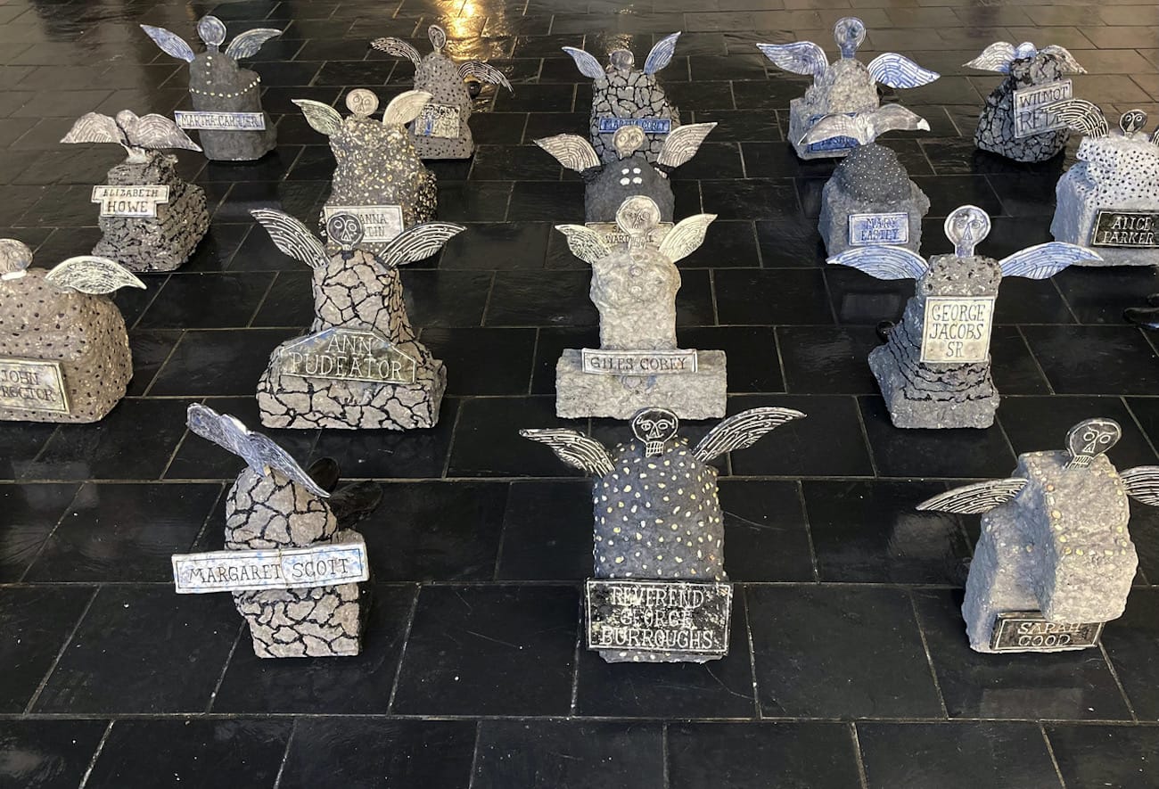 VALHALLA, New York — Among the recent works in a 30-year survey of sculptures and collages by Nancy Bowen at Westchester Community College Art Gallery is a group of 20 tombstones (2020). Made of gray-toned paper pulp encrusted with tiny shells and pebbles, and veined with black pigment, each bears a ceramic plaque with the name of a woman or man killed during the Salem witch trials, an event presided over by one of the artist’s ancestors, Samuel Sewall, who eventually repented and atoned. Bowen took care to individuate each tombstone, surmounted by a set of ceramic wings and a skull facing in one direction, and grounded by ceramic shoes that project from the bottom. The head-and-wings motif is from early American funerary art, and symbolizes both mortality and resurrection; the shoes convey a feeling that these whimsical little characters — for that is what they are — might transcend their horrible fate by simply picking up and walking away.