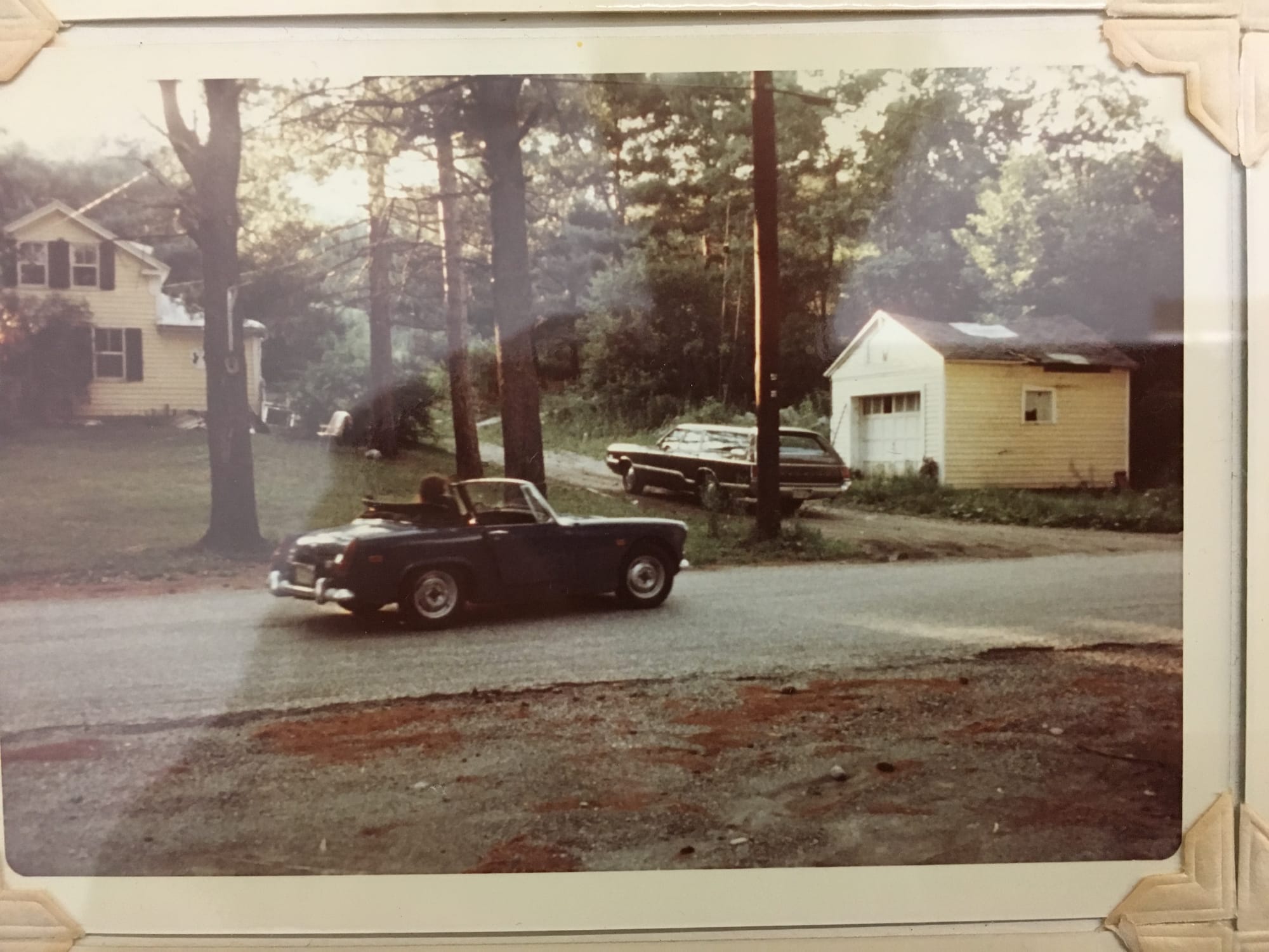 Mayer’s photograph is beautiful. The image was taken somewhere suburban. What looks like a green MG to me, is on the road passing a white, wood frame house with dark shutters that has a small outbuilding one-car garage. An elongated, brown station wagon is parked at the end of the driveway. It looks so time specific. Of course, the cars contribute to that, but so does the quality and resolution of the photograph, its modest scale, the way it has faded over time.