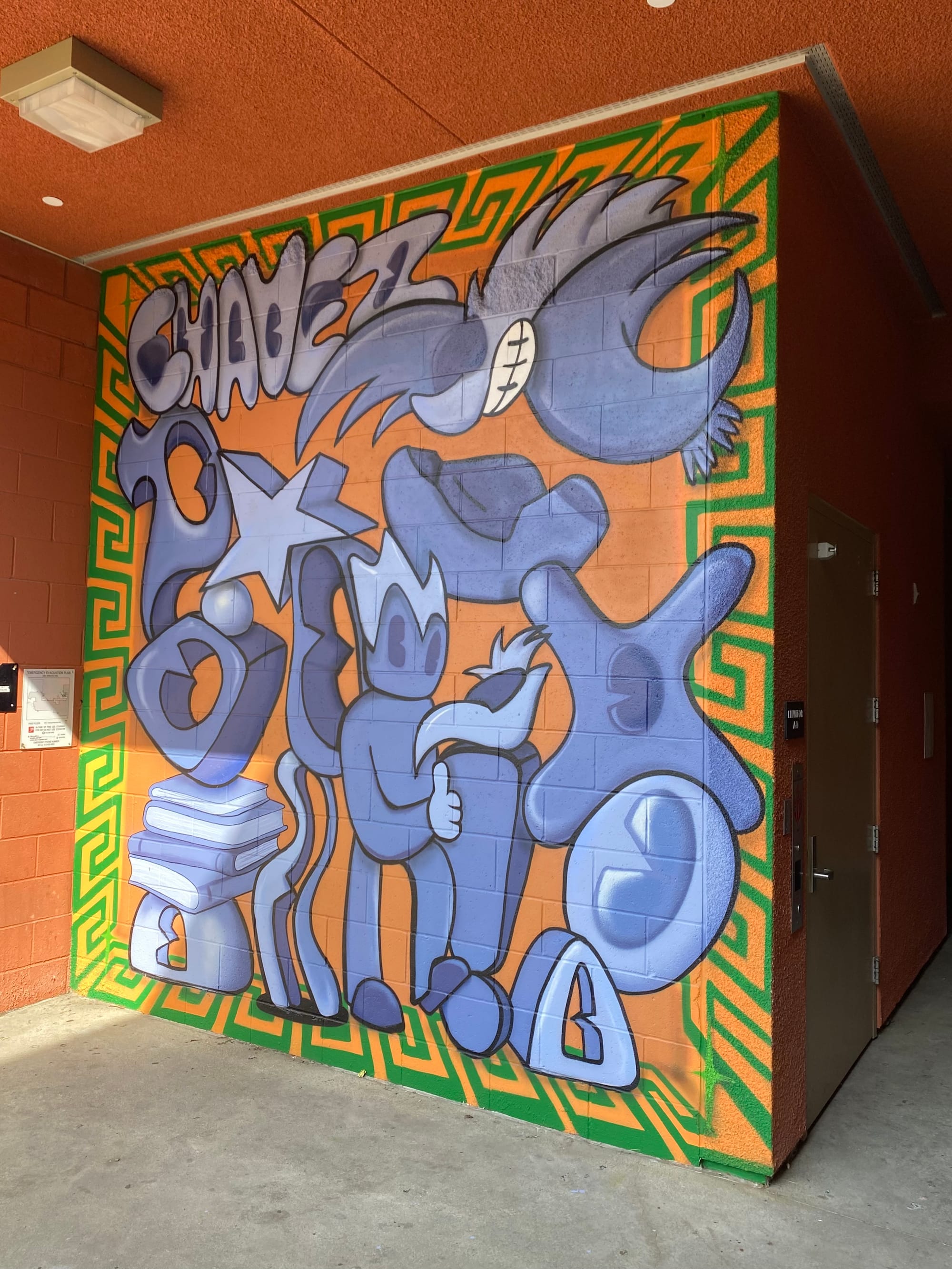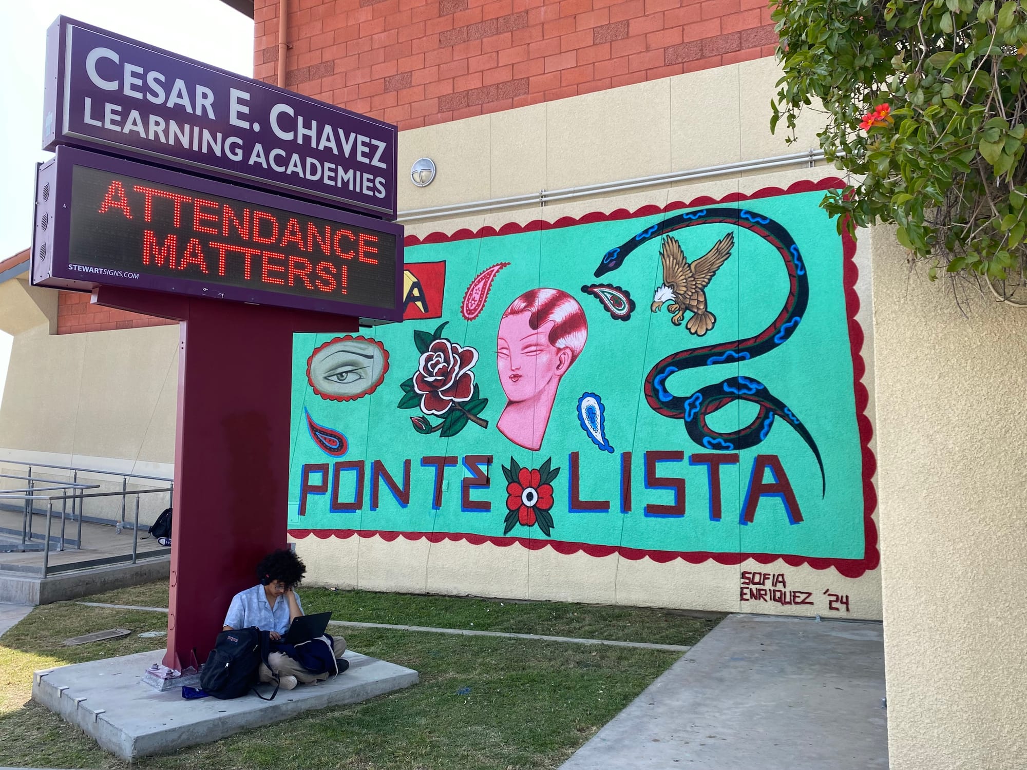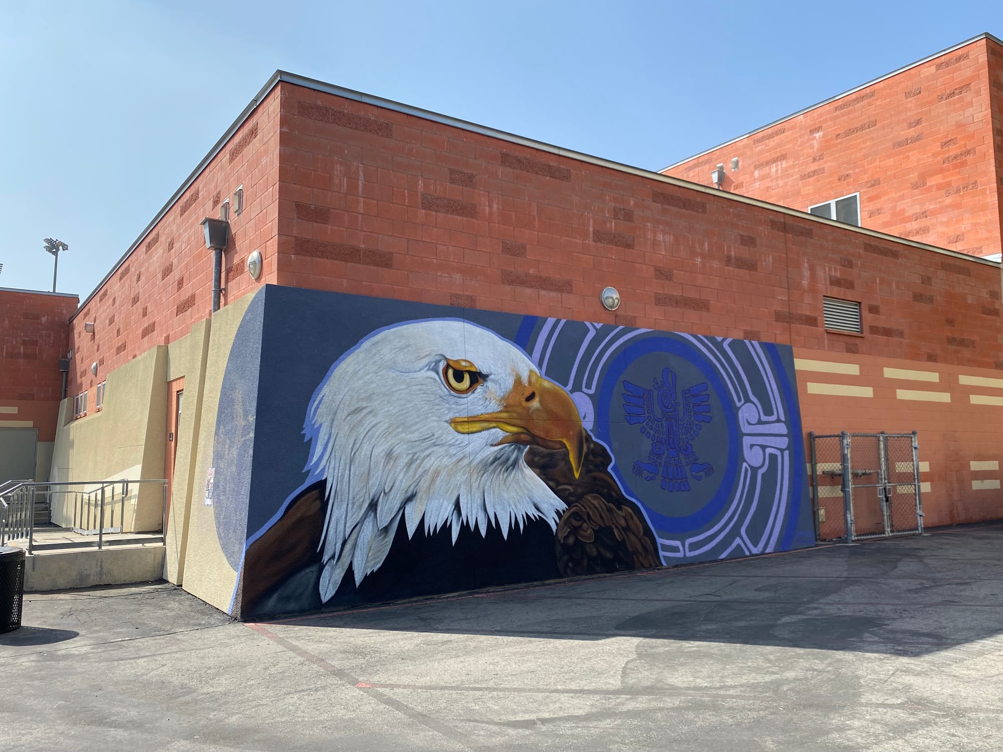 The final designs reflected what students felt was meaningful, from portraits of labor leaders César Chavéz and Dolores Huerta to images of eagles — the school’s mascot, but also an important symbol for Mexican Americans in a school that is about 95% Latino. They featured quotes like “Sí Se Puede!” (“Yes We Can”) and “Sueña Grandes Sueños” (“Dream Big Dreams”) as well as graphics that corresponded to one of the four high schools that make up the César E. Chávez Learning Academies: ArTES (Arts, Theatre, Entertainment) Magnet, Social Justice Humanities Academy, Academy of Scientific Exploration, and the Technology Preparatory Academy.