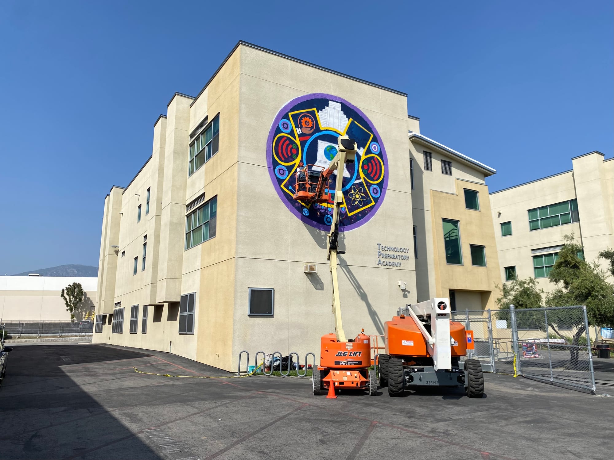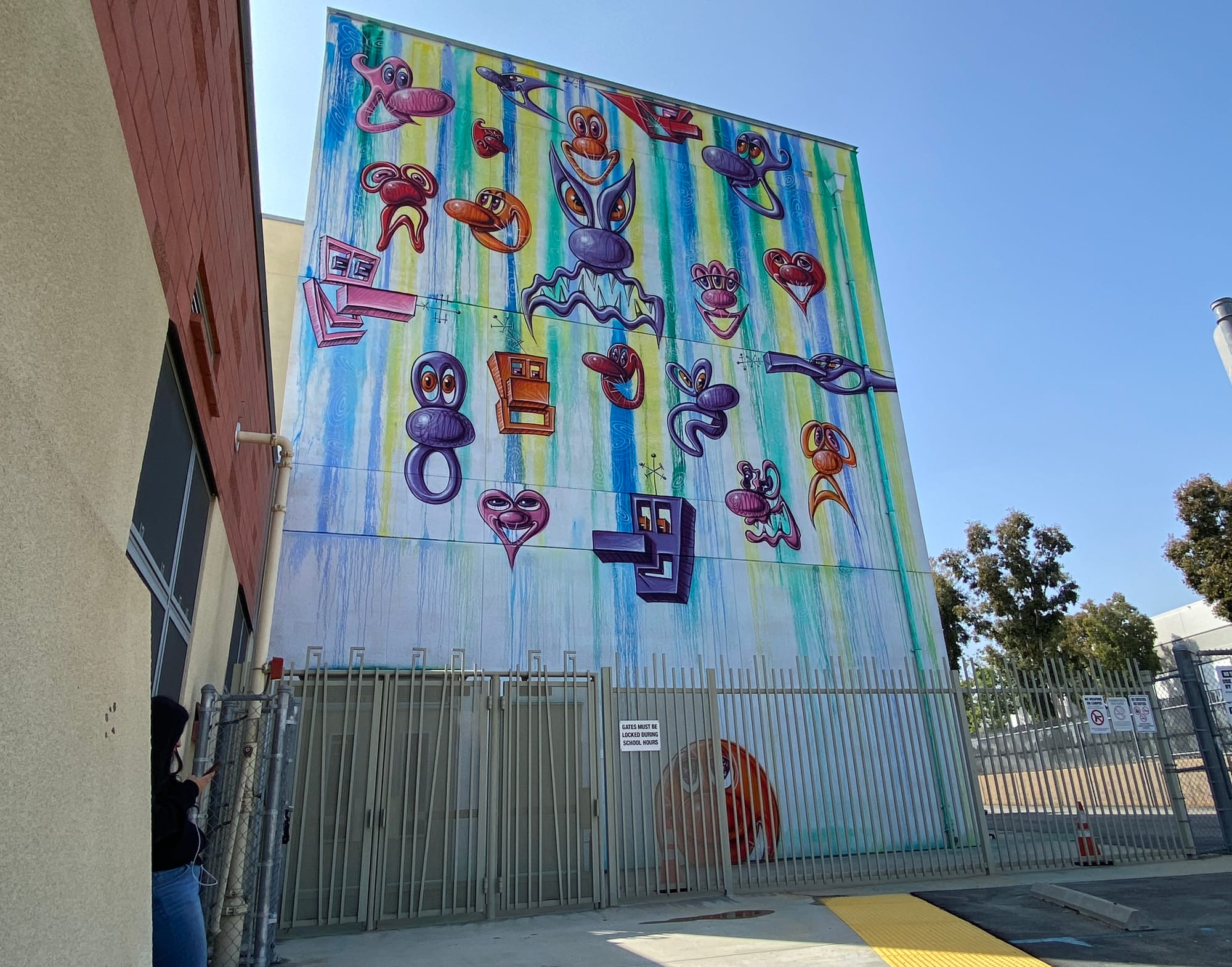 SAN FERNANDO, Calif. — For the past two weeks, dozens of artists and students have been hard at work covering the campus of the César E. Chávez Learning Academies (CCLA) in a series of new murals. The project is the latest in an eight-year partnership between the Los Angeles Unified School District (LAUSD) and Branded Arts, an LA-based organization that has produced over 700 murals around the world. For this latest project, Branded Arts tapped an eclectic group of 15 artists, from well-known names in the worlds of street and fine art to veteran muralists with deep ties to local communities, including Kenny Scharf, MURO, Ozzie Juarez, Erica Friend (aka Insomniart), Carlo Valentino, Jesica Burlaza, Levi Ponce, and Shantell Martin.