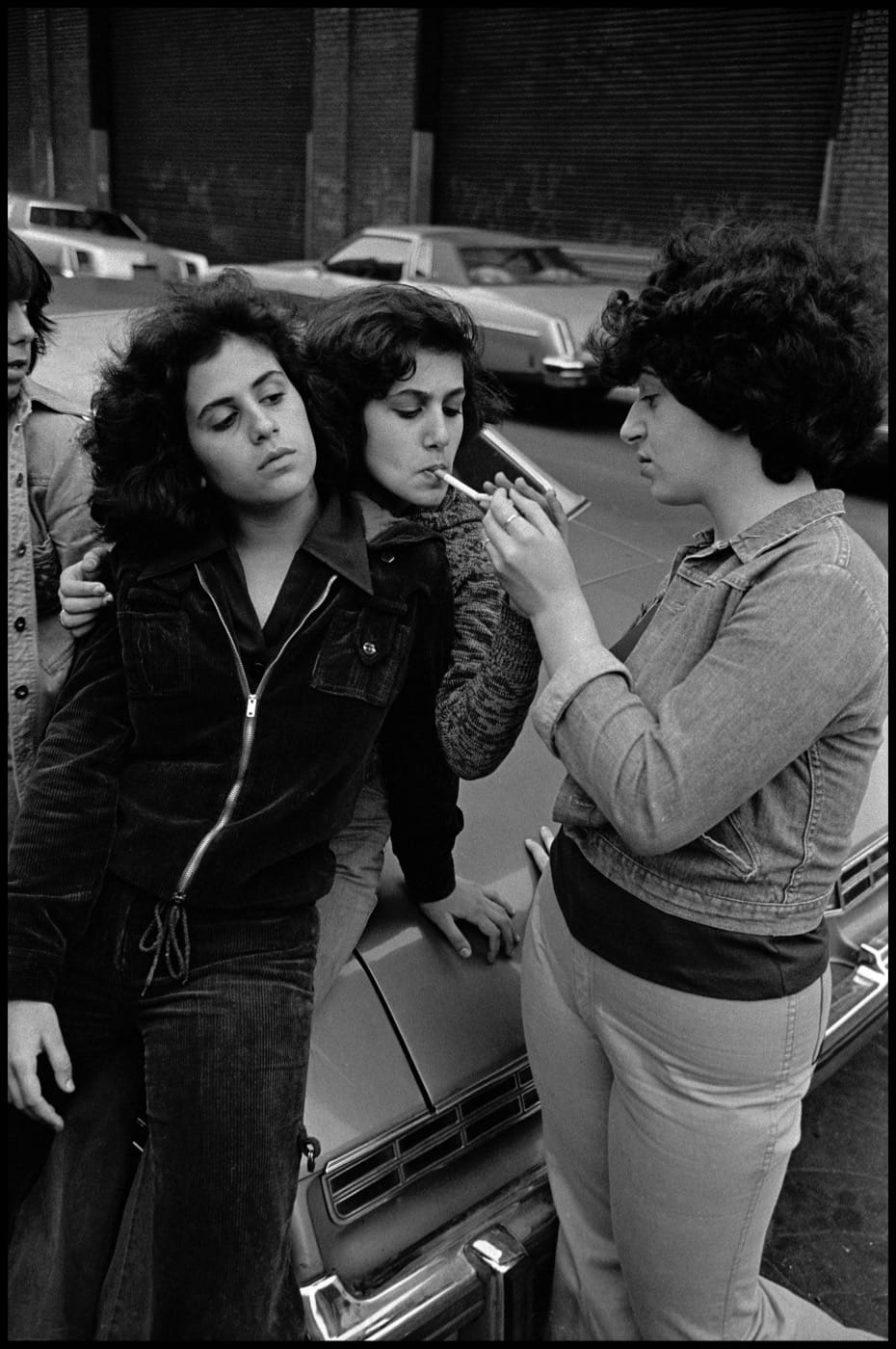 The works are culled from two specific years that Meiselas photographed the teenagers: 1976 and 1978 (though an accompanying catalogue for the show draws from a more expansive selection of the photos). The earlier images depict them quite young, about 12 or 13 years old, still very much behaving the way children do: blowing chewing gum bubbles as they mug for the camera, dawdling on the sidewalk in Catholic school uniforms, and gossiping as they sit draped over two-wheeler bicycles. Two years later, these same girls preen at Rockaway Beach, light each other’s cigarettes, and recline languorously against cars parked on the street. In the image “Dee and Lisa on Mott Street” (1976), the eponymous girls lean shoulder-to-shoulder, exchanging a side-eye glance that suggests bravado, affection, and rivalry. In “Dee and Lisa Fight on Prince Street” (1976) they tussle wildly — one girl sobbing as she grabs at the jacket of the other who is trying to flee. The blurred focus of the shot adds to the fraught animalistic nature of their brawl. Despite their youth, their flintiness is undeniable — a testament to the rawer, grittier New York they inhabited in the 1970s. Meiselas captured not only the maturation of the girls, but also a microcosm of the city usurped by New York’s unending evolution. The ethnic enclave of Little Italy is almost no more, shrunken by the sprawl of Chinatown, insidious boutiques, and pie-in-the-sky condos that have now overtaken downtown Manhattan.