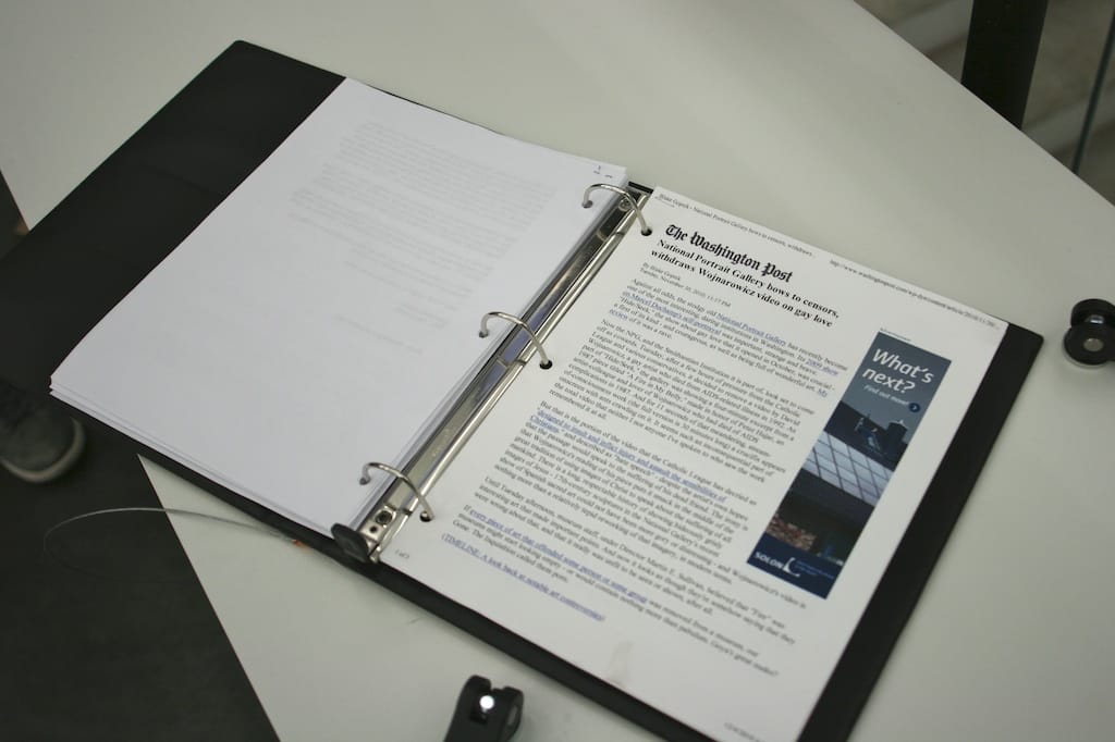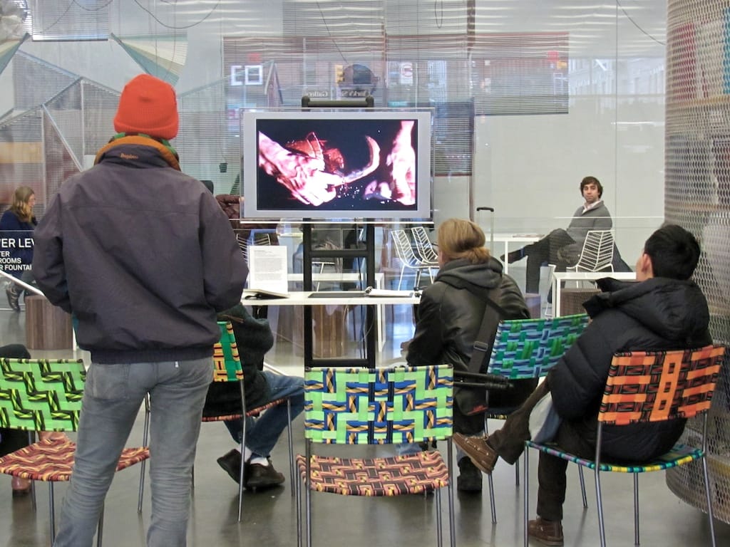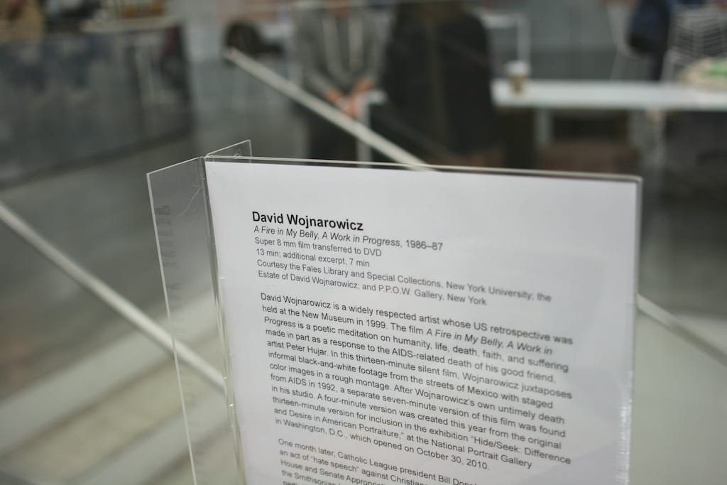 The video is on its own pedestal in front of the cafe in the New Museum, displayed on a large TV monitor. On the table below the monitor is a binder of news clippings documenting the controversy over the Smithsonian’s removal of the video, along with a plastic-mounted label explaining the details of the piece. Very visible in the lobby, the New Museum has made a strong statement by supporting the artist and the National Portrait Gallery’s curatorial decision to include the piece.