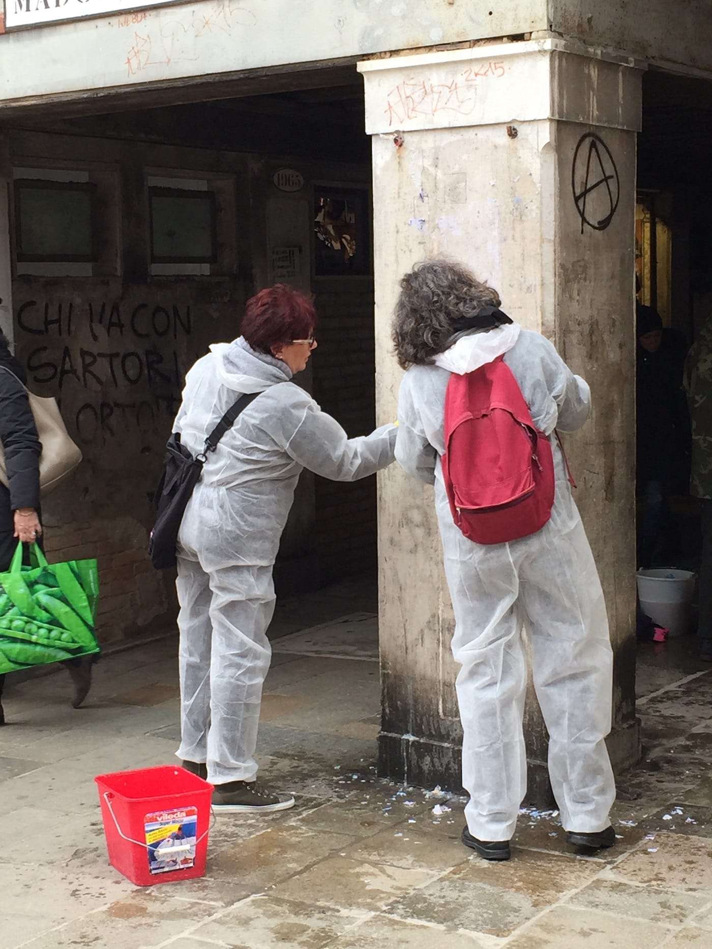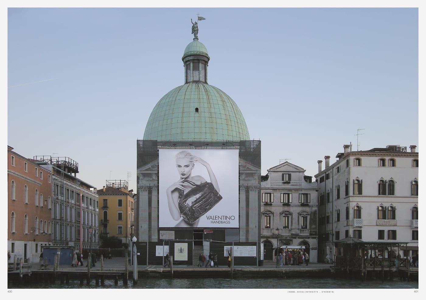 Scheppe writes, “Venice has become the sum of its own images, making its visual reproduction the main guarantor of the city’s economic viability.” Nowadays, though, the façades of many of Venice’s iconic old buildings are routinely covered by advertising billboards, obscuring their architectural details. Still, selfie-snapping is incessant. Each day, day-trippers and overnighters combined nearly double Venice’s permanent population of roughly 55,000 (which is becoming ever older as young people leave in search of non-tourism-related job opportunities and affordable housing).
