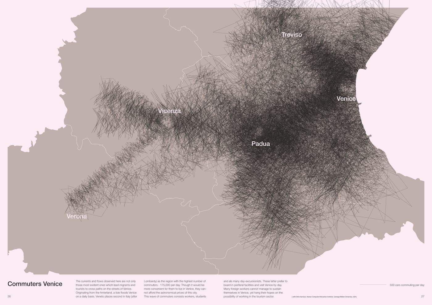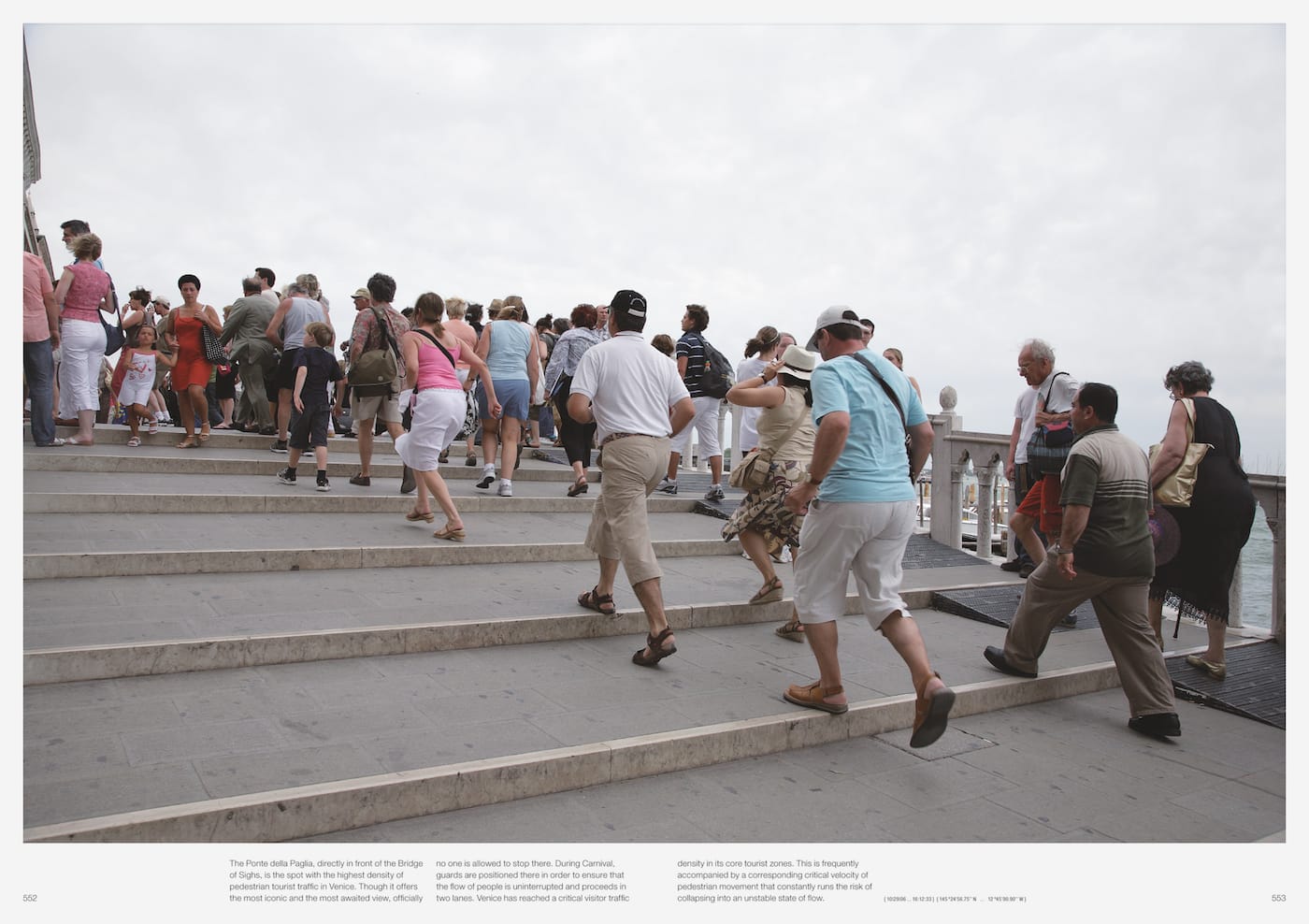 Writing in the book’s lead essay, Scheppe notes that this study “makes a fundamental distinction between two motion patterns associated with globalization that intersect in [Venice’s] city center.” One reflects a “desired,” and the other a “forced” “movement of place”; the former is that of immigration, while the latter is that of tourism. Scheppe writes, “In the terminology of this [book’s] investigation, they are called leisure-based mobility and subsistence-based mobility.” In short, some people go to Venice for pleasure, because they want to and can; others make the journey for survival’s sake.