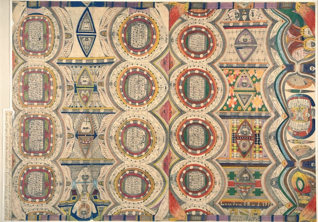 Given the scope and richness of Adolf Wölfli’s oeuvre — which consists of forty-five large-format, handmade, text-and-image-filled books; more than a dozen notebooks; several hundred, single-sheet drawings; and a handful of objects, including painted pieces of furniture — to tell the story of this prolific autodidact’s extraordinary artistic journey is challenging, especially when his creative power, mythologized by Wölfli himself, is as much a central theme of his work as any of the recognizable subjects to which it refers.