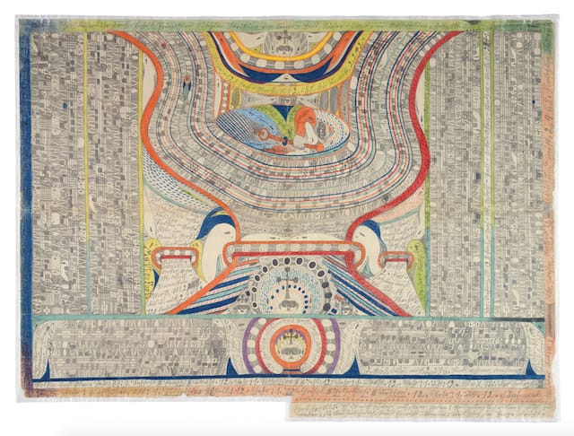 In the exhibition, the moment around 1907 when Wölfli’s earliest, gray-toned drawings, with their empty musical staves, give way to even more elaborate compositions in full, exuberant color, filled with enigmatic musical notation which, to this day, no one knows exactly how to read, is a spectacular one. Since, after all, St. Adolf had an entire world to create, it comes as no surprise that the selection of drawings on view depicts or alludes to a wide range of subjects, including the Amazon River region, London, Samoa, the city of Bern, the Vatican and more. In the works on view, Wölfli’s intricate compositions take the forms of mandala-like rings filled with musical notation, swirling ribbons of rainbow-tinted color or patterning, and even a gigantic snake, whose coiled body surrounds more passages of written music.