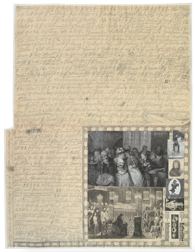 This theme of self-congratulatory celebration continues in the next section of Wölfli’s oeuvre, the Album Books with Dances and Marches (1924-1928, totaling some 5000 pages), which are filled with sequences of words and musical compositions. In the final section of his big work, the Funeral March (1928-1930), which boasts more than 8000 pages, filling 16 books, Wölfli used little more than musical-sounding sequences of rhymes based on Swiss-German dialect words to produce a kind of requiem. It succinctly reprises the central themes of his St. Adolf-created world. Here, his colorful pictures are replaced with collaged images from magazines, advertisements and other sources. Their subject matter evokes some of the specific and broader themes Wölfli introduced earlier in his vast narrative.