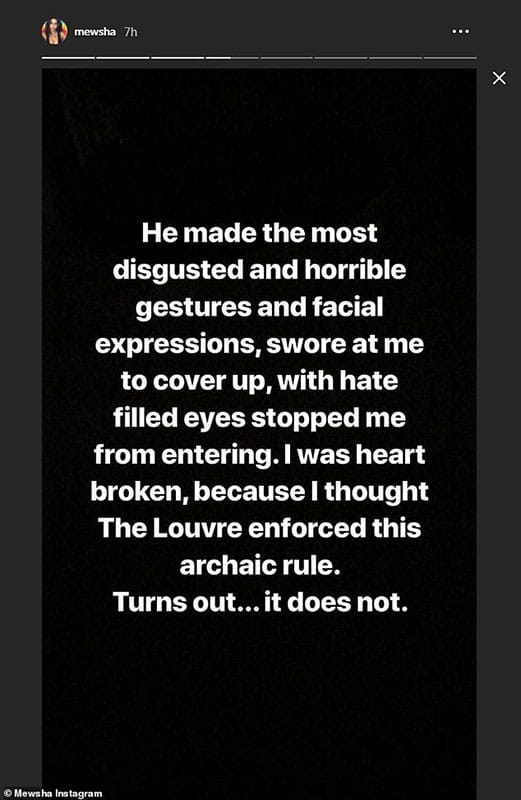 “Yesterday at the Louvre, I was stopped at the entrance by a guard for my outfit,” wrote Syeh. “He made the most disgusted and horrible gestures and facial expressions, swore at me to cover up, with hate filled eyes stopped me entering,” she continued. “I was heartbroken, because I thought the Louvre enforced this archaic rule [sic]. Turns out it does not.”