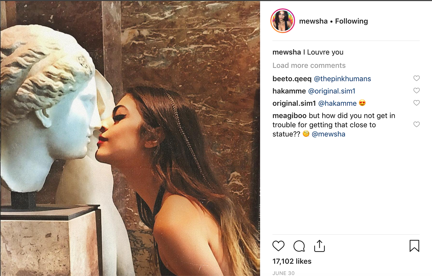 While the “what were you wearing” defense has come to light these days as inappropriate and offensive grounds to infringe upon the rights of women in free society, it must be noted that Syeh seems to have boundary issues when it comes to the Louvre. In a June 30 Instagram post, Syeh is pictured leaning in dangerously close to a piece of marble statuary for a kiss, while wearing bright red lipstick. Though her choice of dress is by no means an invitation for banishment, it seems that in the case of Syeh vs. The Louvre, the disrespect is mutual. One suggests both parties examine their conducts, given the tendency of photo-seeking museum-goers to sometimes destroy priceless works of art.